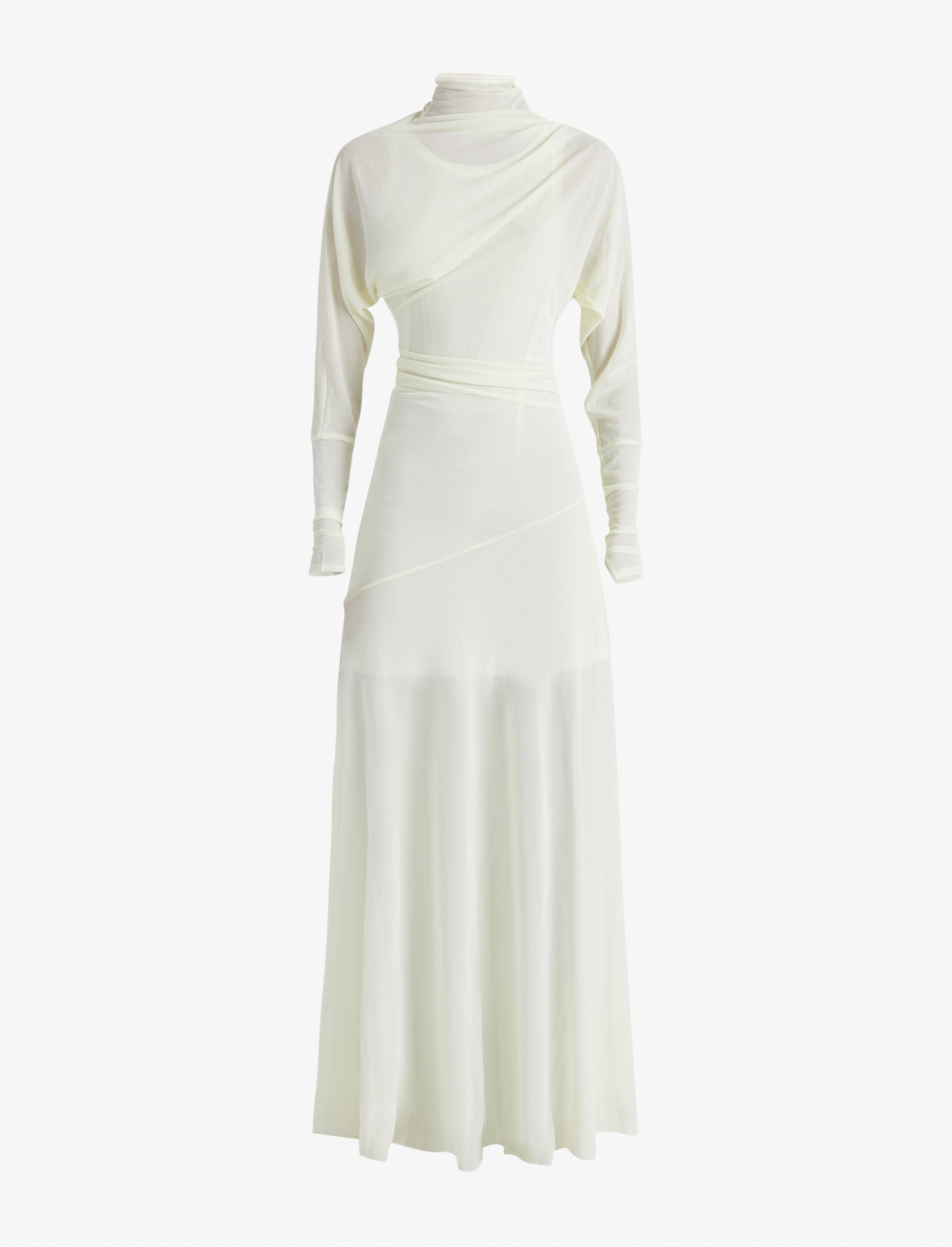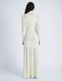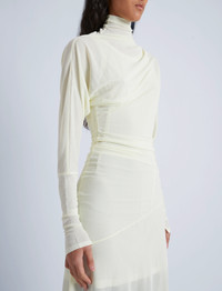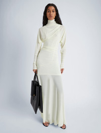 The Paula Dress in Sheer Crepe Jersey is crafted to a high neck silhouette with an asymmetric drape. Kimono style sleeves with small slits at the wrists detail the dress form. Completed with a tonal sleeveless slip. Details - Citron - Delicate fabrication - High neck - Asymmetrical drape - Kimono sleeves - Small slits at wrist - Slim fit - Ankle length - Includes slip - 82% viscose, 18% polyamide - SKU: R2443020JY112719 Size & Fit - Model is 5'9'' with 30'' bust / 34.5'' hips. Wearing size 4 Care - 82% viscose, 18% polyamide - Dry clean only