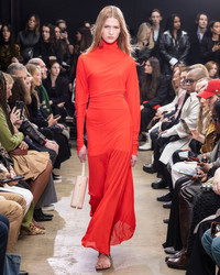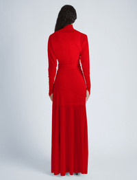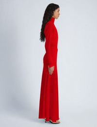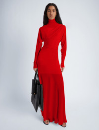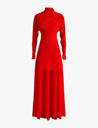 Fall 2024 Runway Collection | Look 15 The Paula Dress in Sheer Crepe Jersey is crafted to a high neck silhouette with an asymmetric drape. Kimono style sleeves with small slits at the wrists detail the dress form. Completed with a tonal sleeveless slip. Details - Red - Delicate fabrication - High neck - Asymmetrical drape - Kimono sleeves - Small slits at wrist - Slim fit - Ankle length - Includes slip - 82% viscose, 18% polyamide - SKU: R2443020JY112600 Size & Fit - Model is 5'9'' with 30'' bust / 34.5'' hips. Wearing size 4 Care - 82% viscose, 18% polyamide - Dry clean only