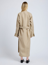 The Phillipa Dress in Stripe Cotton Silk Poplin features an oversized silhouette with a self-tie waist that can be worn belted or unbelted. Finished with a neck scarf detail, concealed placket, and side slip pockets. Details - Taupe multi - Stand collar - Neck scarf - long sleeves - Gusseted sleeve cuffs - Concealed placket - Side slip pockets - Raised sides - Relaxed fit - 82% cotton, 18% silk - SKU: R2533020SC101284 Size & Fit - Model is 5'10.5'' with 32'' bust / 33'' hips. Wearing size 8 Care - 82% cotton, 18% silk - Dry clean only