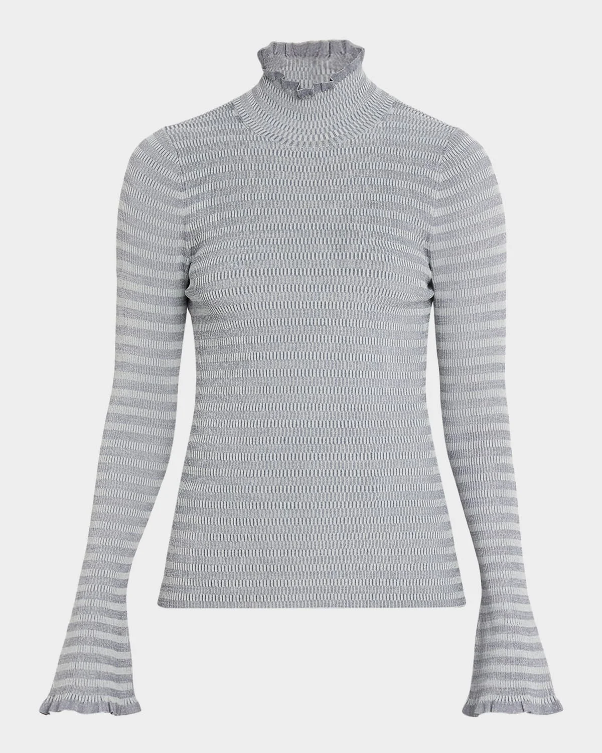 Proenza Schouler White Label "Phyllis" geometric knit top finished with subtle flared trim Turtleneck Long sleeves with flared cuffs Classic fit Hem sits at the hip Pullover style Rayon/cellulose acetate Dry clean Imported