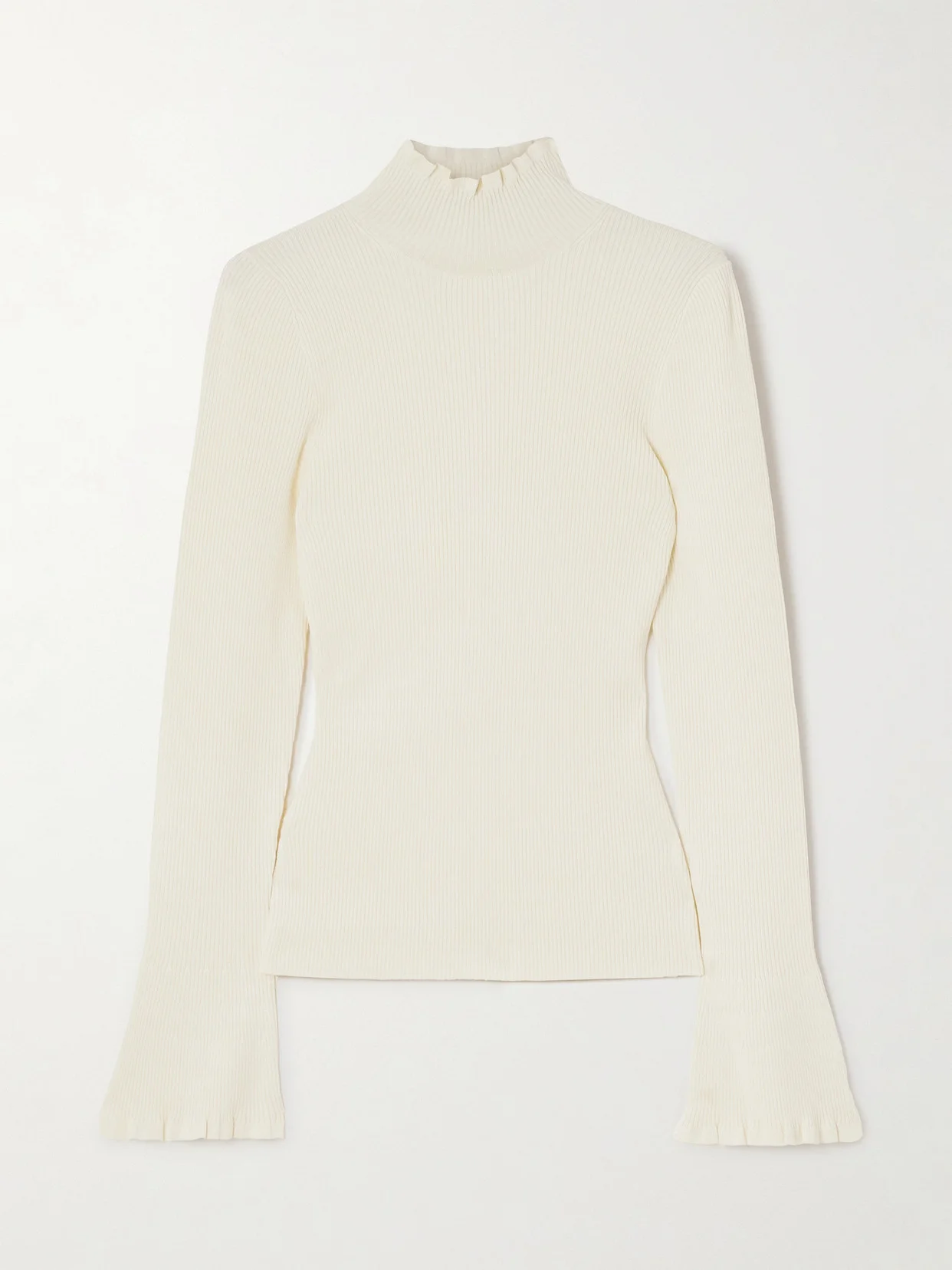 Proenza Schouler White Label's 'Phyllis' sweater is rib-knitted in a classic off-white shade that's endlessly versatile. It's designed for a close fit and has ruffles along the turtleneck and flared cuffs.
