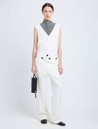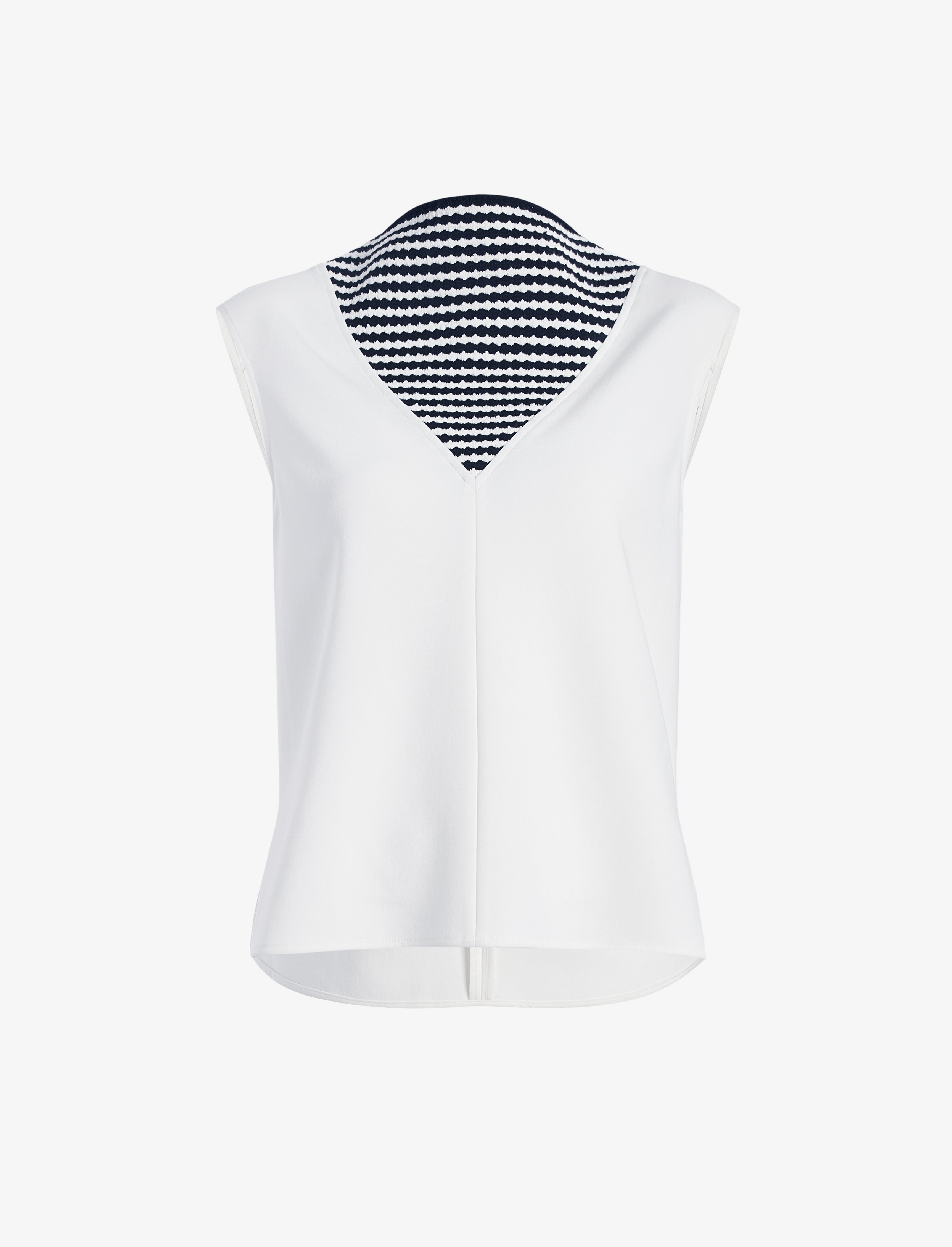The Prescott Top in Matte Viscose Crepe features a slim mock-neck silhouette with a contrasting striped knit panel, finished with a keyhole detail at the back neck. Details - White multi - Mock neckline - Sleeveless - Knit striped panel - Keyhole detail - Side slits - Straight hem - Slim fit - 70% triacetate, 30% polyester - SKU: R2524017BY116114 Size & Fit - Model is 5'11'' with 30'' bust / 35.5'' hips. Wearing size 4 Care - 70% triacetate, 30% polyester - Dry clean only