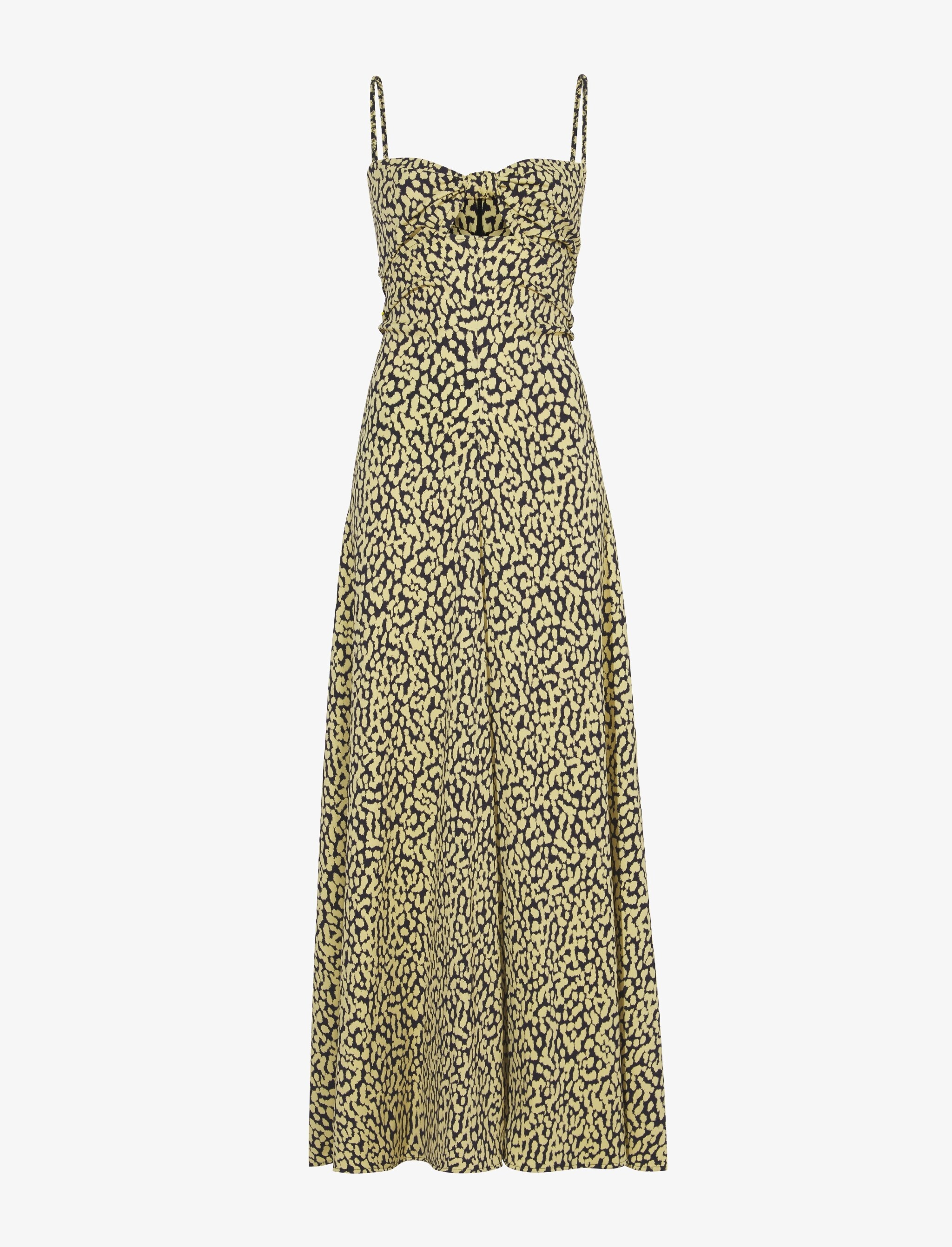 The Printed Leopard Tank Dress is cut to an A-line silhouette and features an all-over leopard print in yellow and black. Sweetheart neck with knot and cut-out at center. Slim elasticated shoulder straps. Ruching through the waist. Fitted waist. Invisible center-back zip closure. Mid-length hem. Lined. 97% viscose, 3% spandex. SKU: R2323014BYP261721