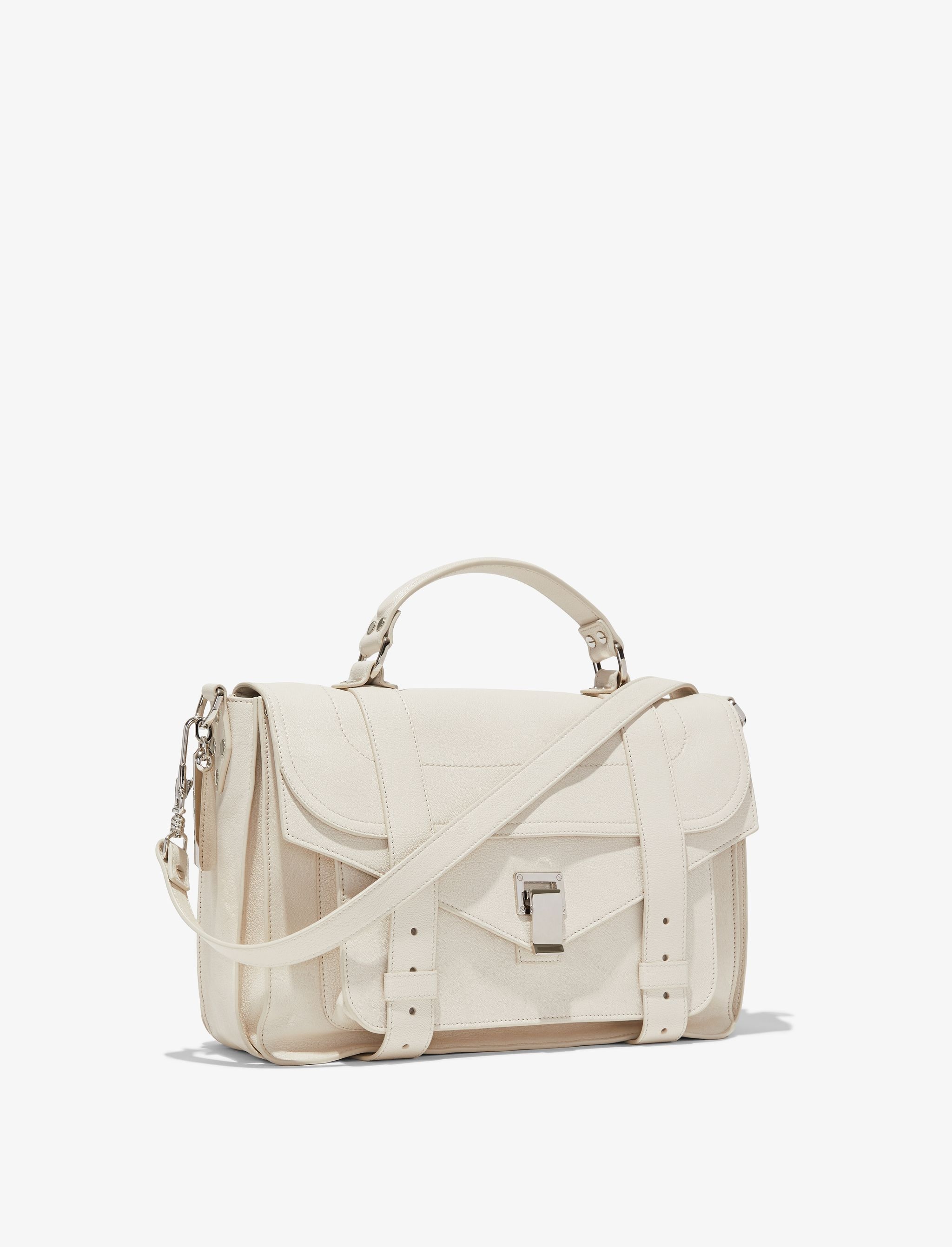 Inspired by traditional workwear satchels, the iconic PS1 family is rooted in function and ease. The PS1 Medium Bag is crafted in off-white leather and is secured by a signature silver-tone tab closure and belted straps. Features an interior compartment with a durable canvas lining and leather trimmed zip pocket. The exterior features a zip pocket and gusseted compartment on the front and a zip pocket on the back. Includes a sculpted top handle and a removable, adjustable shoulder strap with hand-painted edges. Enameled logo tag. Lambskin. Made in Italy. The PS1 family consists of a Micro, Mini Crossbody, Tiny, Medium, and Large. The PS1 Medium is the second largest body of the family. W: 31.5cm x H: 21.5cm x D: 10cm Shoulder Strap: 52.5cm Top Handle Height: 8cm SKU: H00002L001P1036