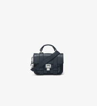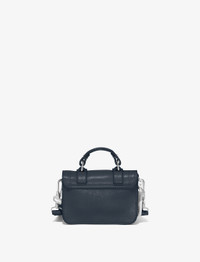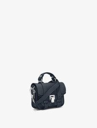 Introducing PS1 Micro Bag, the miniature-sized addition to the PS1 Handbag family. The PS1 Micro Bag is crafted in dark navy leather and secured by a signature silver-tone tab closure and belted straps. The exterior features a gusseted compartment on the front. Includes a sculpted top handle and a removable, adjustable shoulder strap. Embossed logo tag. Canvas interior lining. 100% lambskin. Made in Italy. The PS1 family consists of a Micro, Mini Crossbody, Tiny, Medium, and Large. The PS1 Micro is the smallest body of the family. L: 7” W: 3” H: 6” Strap length: 21.5" SKU: H00090L001P5006