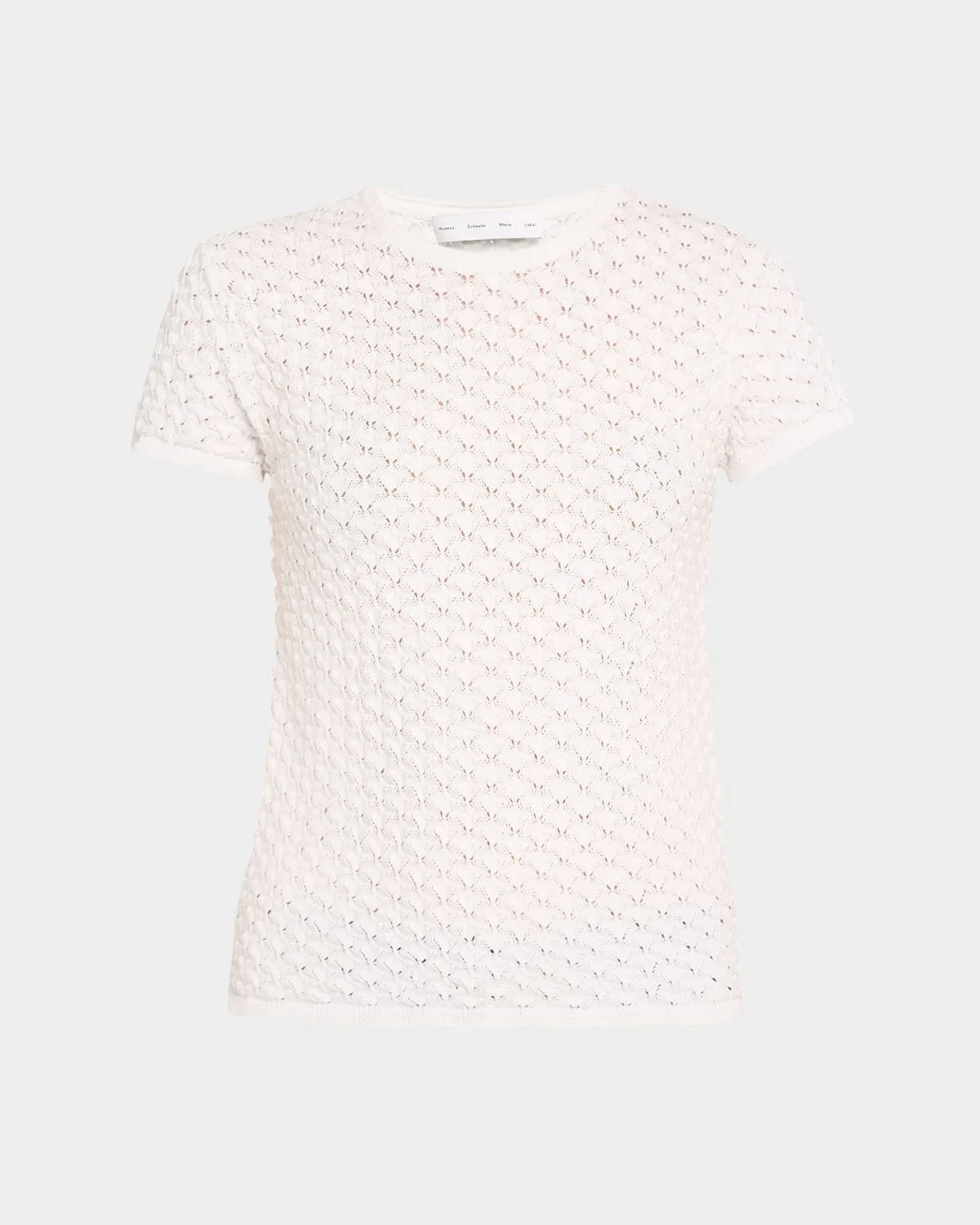 Proenza Schouler White Label "Quincy" crochet knit top Crew neckline Short sleeves Slim fit Hem sits at the hip Pullover style Cotton Dry clean Imported