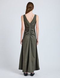 The Remi Dress in Eco Stretch Linen Viscose is crafted to a gently flared silhouette, featuring a deep V-neckline and ruched detailing through the center front and back. Details - Fatigue - V-neckline - Sleeveless - Ruched center - Ankle-length hem - Slim fit - 66% organic linen, 32% viscose, 2% elastane - SKU: R2533014BL001E310 Size & Fit - Model is 5'9.5'' with 32'' bust / 34'' hips. Wearing size 4 Care - 66% organic linen, 32% viscose, 2% elastane - Dry clean only