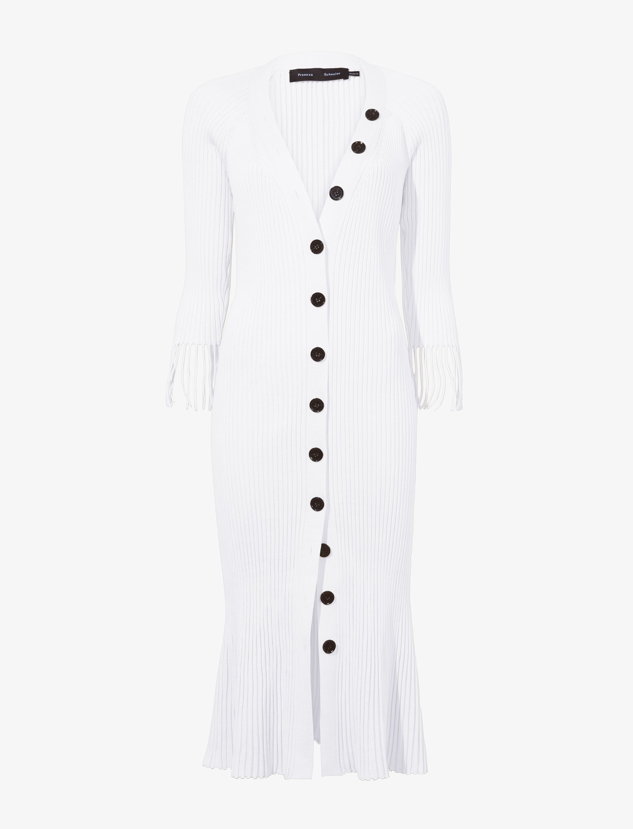 The Viscose Rib Knit Dress in green is crafted to a close-fitting silhouette with a V-neck. Ribbed-knit construction. Long raglan sleeves with fringing. Mid-length hem. Center-front button closure. Slim fit. 90% viscose, 10% nylon. Made in Italy. SKU: R2327069KY281102
