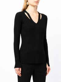 merino rib knit V-neck jumper Laser-cut detailing permeates the AW21 knitwear edit from Proenza Schouler White Label. This jumper is constructed from soft merino and boasts a v-neck with cut-out trims. Imported Composition Merino 100% SIZE & FIT Model measurements Height 5 ft 10 in(1.77 m) Bust/Chest 29.92 in(76 cm) Hips 35.03 in(89 cm) Waist 24.01 in(61 cm) FittingInformation This piece fits true to size. We recommend you get your regular size Cut for a close fit Made with a mid-weight fabric Washing instructions Dry Clean Only