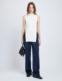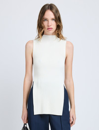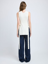 The Rita Top in Rib Knit is crafted to a slim silhouette with a mock neckline. Features hanging ties with silver-tone grommets and a V-cut back. Details - Off white - Mock neckline - Sleeveless - Hanging self-ties - Silver-tone grommets - Open sides - V-cut back neck - Straight hem - Slim fit - 45% acetate, 39% viscose, 8% polyester, 8% polyamide - SKU: R2527235KY349102 Size & Fit - Model is 5'9.5'' with 32'' bust / 34'' hips. Wearing size X-Small Care - 45% acetate, 39% viscose, 8% polyester, 8% polyamide - Dry clean only