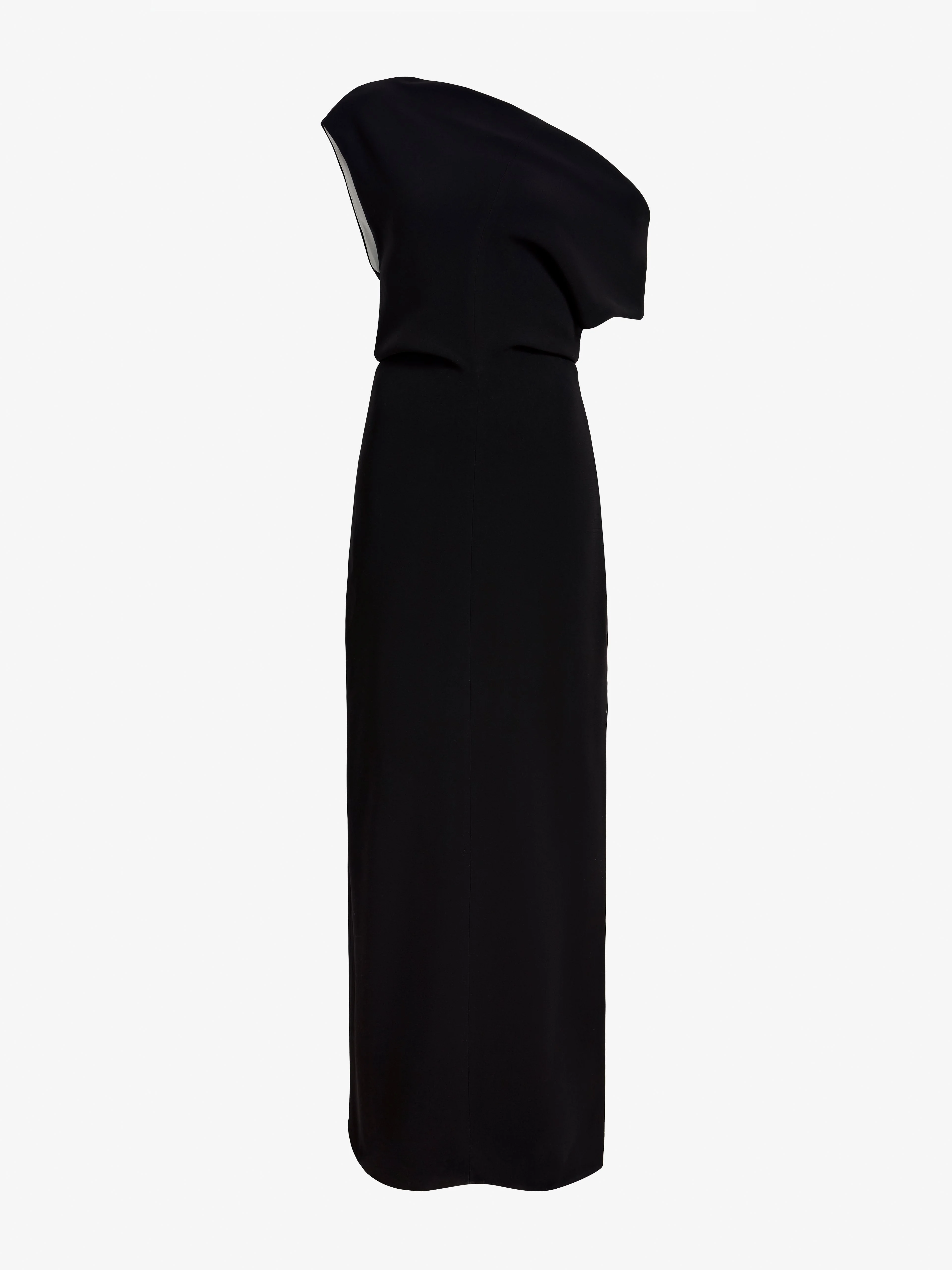 The Rosina Dress in Light Double Crepe is designed with a draped off-the-shoulder neckline that gathers softly at the waist. Falling to floor length, it is finished with a straight skirt and side slits. Details - Black - Draped off-the-shoulder neckline - Gathered waist - Side splits - Straight floor-length hem - Concealed zip back fastening - Slim silhouette - 72% acetate, 28% polyester - SKU: R2613001BY290001 Size & Fit - Model is 5'10'' with 31'' bust / 34'' hips. Wearing size 4 Care - 72% acetate, 28% polyester - Dry clean only