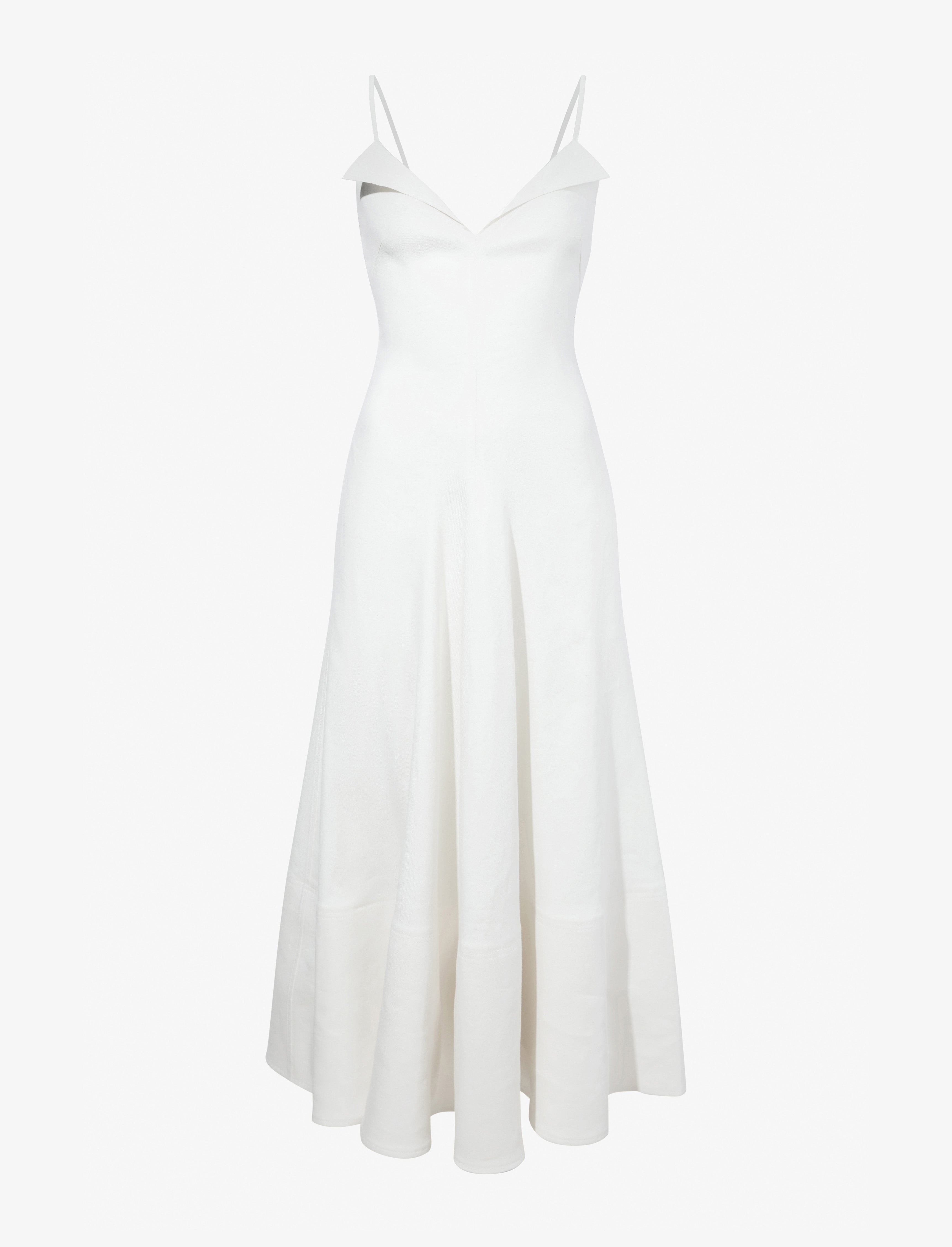 The Ruby Dress in Eco Stretch Linen Viscose is tailored to an A-line silhouette with a V-neckline and thin shoulder straps. Detailed with a ruched back waist and invisible zipper closure. Details - Pearl - V-neck - Sleeveless - Thin shoulder straps - Side slip pockets - Ruched back waist - Center back invisible zipper - A-line silhouette - 66% linen, 32% viscose, 2% elastane - SKU: R2433015BL001E125 Size & Fit - Model is 5'11'' with 28.5'' bust / 34.5'' hips. Wearing size 4 Care - 66% linen, 32% viscose, 2% elastane - Dry clean only
