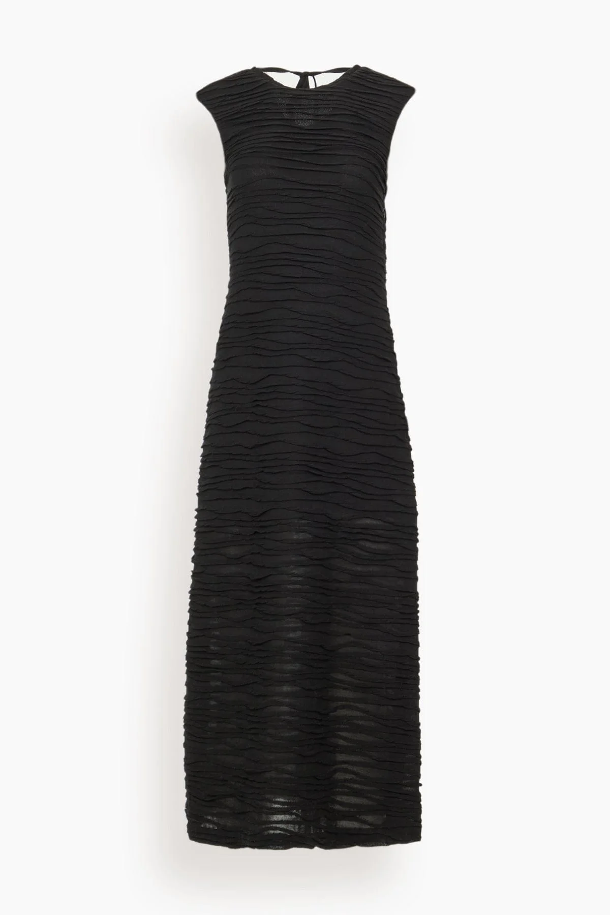 The Proenza Schouler Laura Dress in Textured Cotton Jersey is crafted with tuck detailing throughout. Designed with a crew neckline, cap sleeves, and three adjustable ties—including one at the waist that can be styled at the front or back. - Black - Crew neckline - Cap sleeves - Tuck-textured cotton jersey - Adjustable self-ties - Mid-length hem - Lined - 70% polyester, 30% rayon