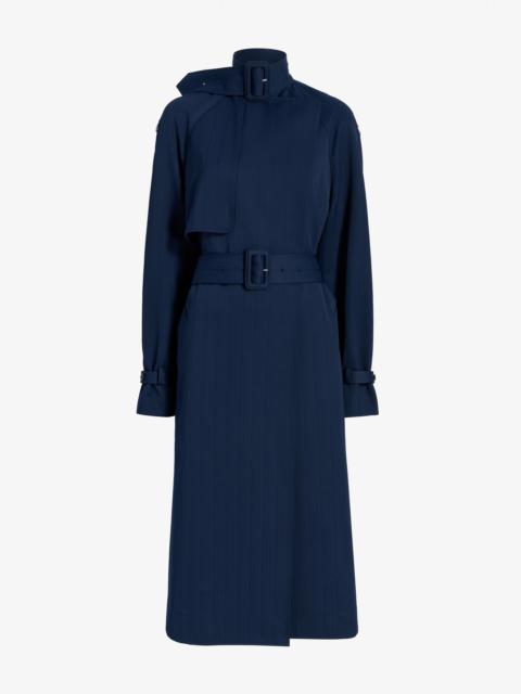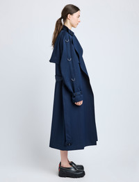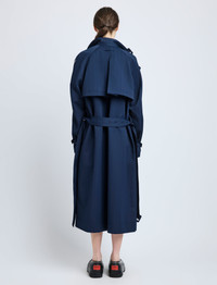 The Sabina Coat in Technical Nylon Jacquard features a lightweight trench silhouette with a double-breasted closure. Detailed with a storm flap, D-ring accents along the sleeves, and side slip pockets. Belts with metal buckles adorn the neck and waist, completing the design. Details - Midnight - Striped jacquard - Water resistant - Lightweight - Belted neck - Long sleeves - Storm flap - Double-breasted closure - Side slip pockets - Detachable waist belt - D-ring sleeve details - Metal hardware - Relaxed silhouette - 100% polyester - SKU: R2521001JQ114401 Size & Fit - Model is 5'11'' with 30'' bust / 35.5'' hips. Wearing size 6 Care - 100% polyester - Dry clean only
