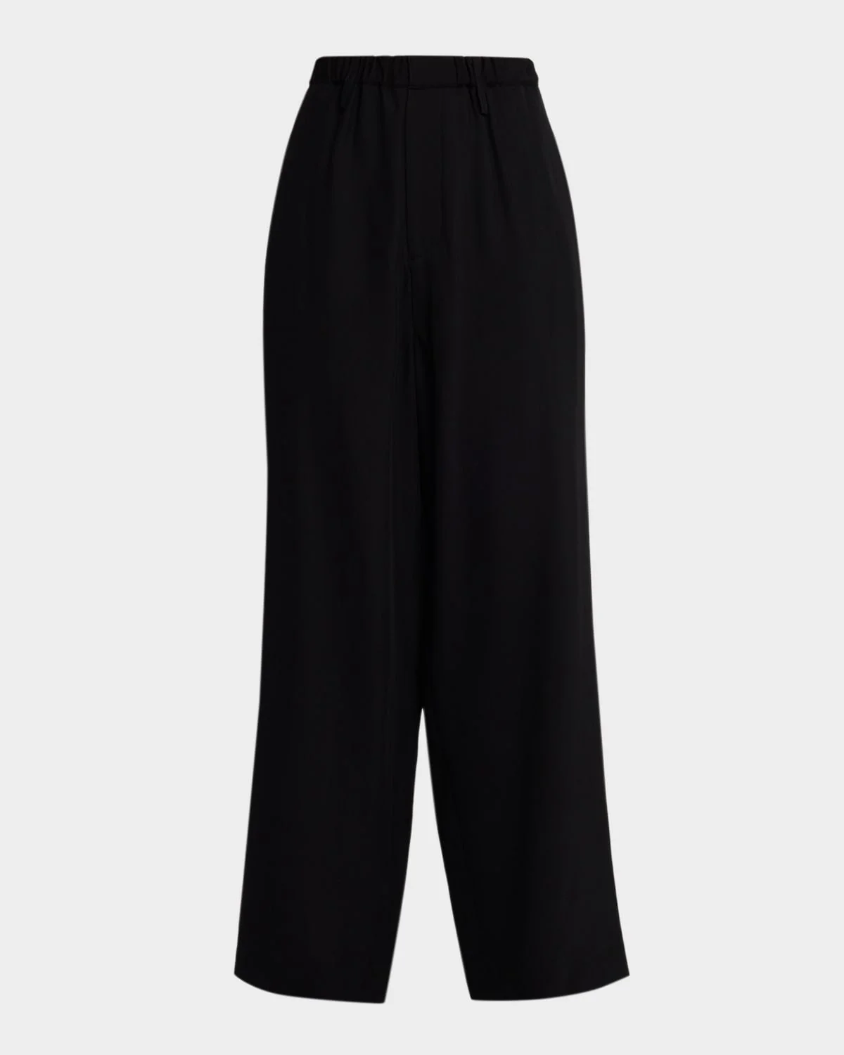 Proenza Schouler "Salome" pants are crafted of woolblend crepe featuring an elasticized waistband Mid rise sits high on hip Angled side slip pockets Back buttonpatch pockets Wide legs Full length Hook/zip fly; belt loops Viscose/wool Made in Poland