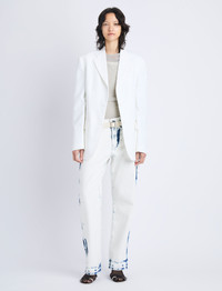 Spring 2024 Runway Collection | Look 1 The Sandis Jacket in Cotton Viscose is tailored to a structural silhouette with notch lapels. Detailed with a triple button closure and flap pockets. Details • White • Notch lapels • Long sleeve • Front button closure • Tonal buttons • Split cuffs • Straight hem • Fully lined • 57% viscose, 43% cotton • SKU: R2422004AY181100 Size & Fit • Model is 5'10'' with 29'' bust / 34'' hips. Wearing size 4 Care • 57% viscose, 43% cotton • Dry clean only