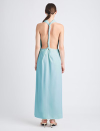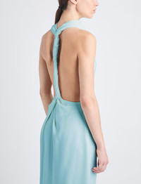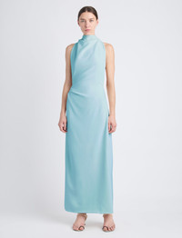 The Selena Twist Back Dress in Matte Double Crepe is cut in matte crepe with a fluid drape. Features a high mock neck and a single twisted strap at the center-back. Details - Pale blue - High mock neck - Sleeveless - Twisted strap at back - Open back - Maxi-length hem with side split - Concealed zip side fastening - Slim fit - 70% triacetate, 30% polyester - SKU: SP2433044BBY116453 Size & Fit - Model is 5'10'' with 33'' bust / 35'' hips. Wearing size 4 Care - 70% triacetate, 30% polyester - Dry clean only