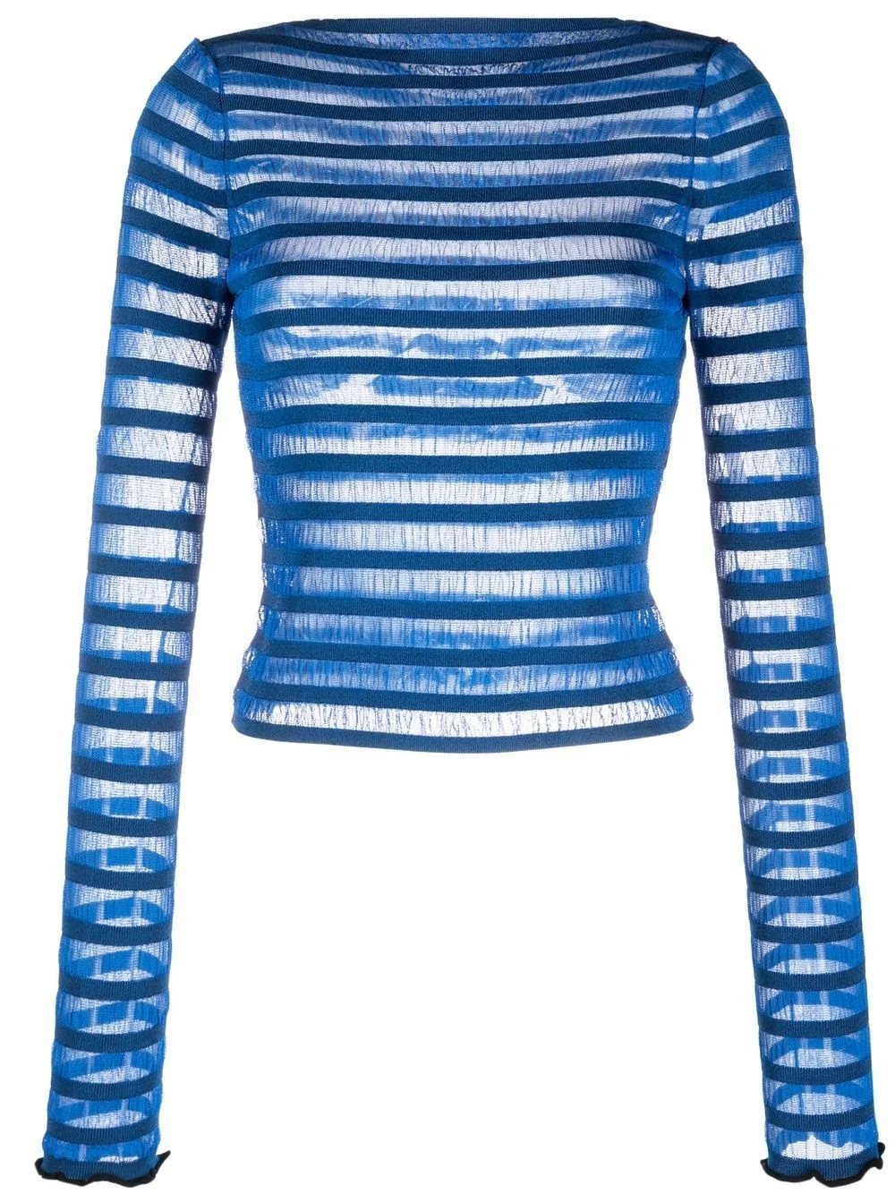 semi-sheer long-sleeve jumper Proenza Schouler White Label's top has a crinkled semi-sheer construction that reveals glimpses of skin. The stretchy fabric is topped with horizontal stripes. Highlights - Blue - Crinkled finish - Contrasting trim - Semi-sheer construction - Boat neck - Long sleeves - Cropped Imported Composition Viscose 71%, Polyamide 21%, Polyester 7%, Elastane 1% Washing instructions Dry Clean Only