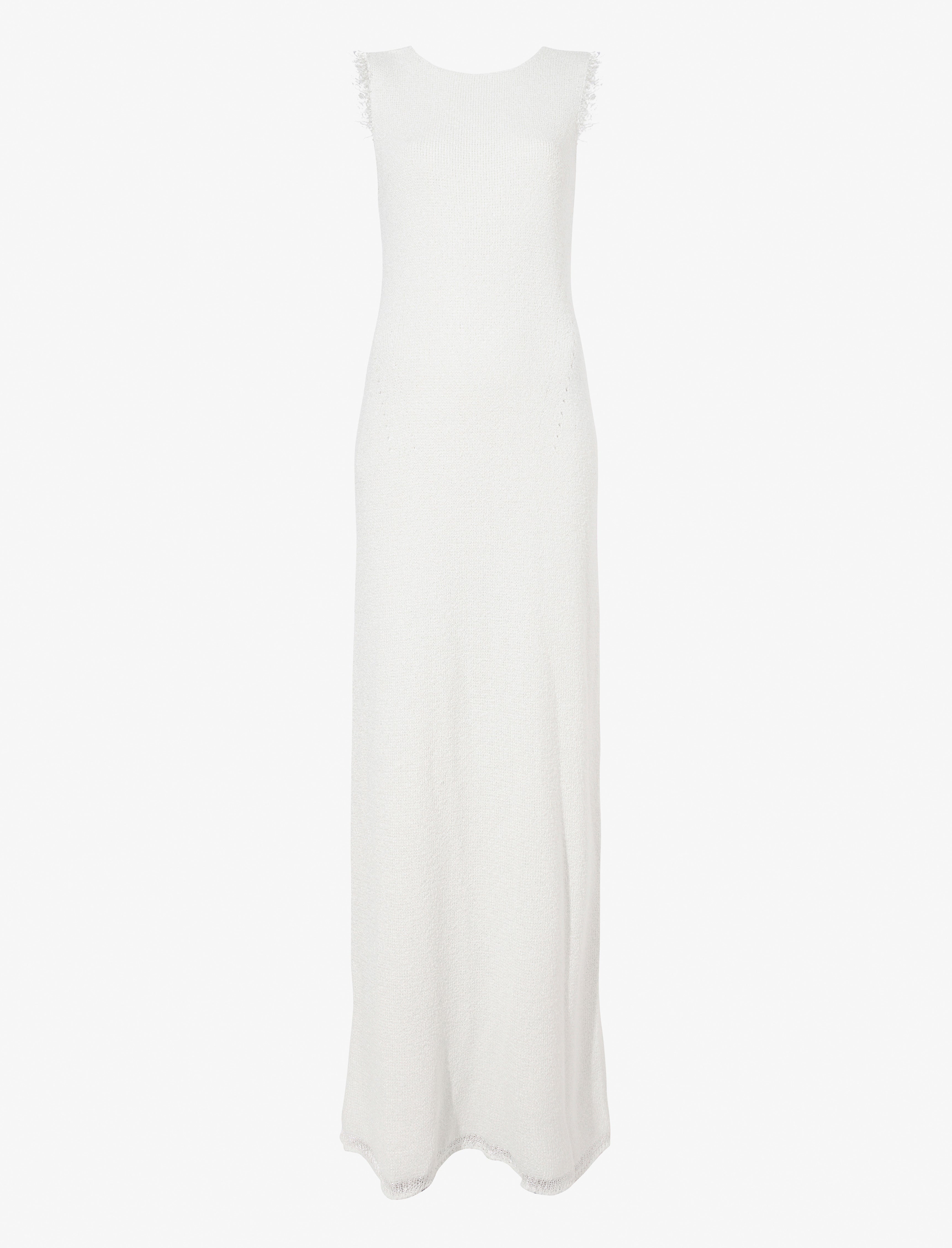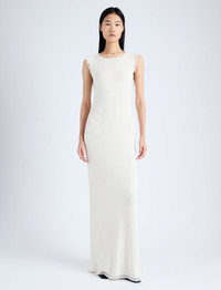 The Silvia Backless Dress in Silk Doubleface is knit to a slim maxi-length silhouette with frayed sleeve ends. Features a slim self tie at the neck, open cut back and pointelle detailing along the sides of the dress. Finished with a sheer hem. Details • Pearl • Textured knit • Crewneck • Sleeveless • Frayed sleeve edges • Back neck self tie • Open back • Sheer hem detail • Maxi length • Slim silhouette • 64% viscose, 36% silk • SKU: R2437171KY325125 Size & Fit • Model is 5'11'' with 28.5'' bust / 34.5'' hips. Wearing size Small Care • 64% viscose, 36% silk • Dry clean only