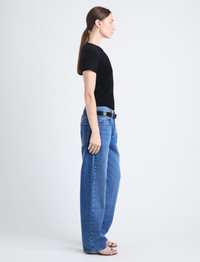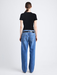 The Sky Top in Matte Viscose Rib is crafted from a rib knit fabrication to a fitted short sleeve silhouette. Detailed with a center seam stitch down the front of the top. Details • Black • Rib knit • Crew neck • Short sleeve • Front seam stitch detail • Full length • Slim fit • 81% viscose, 19% polyester • Made in China • SKU: R2427153KY283001 Size & Fit • Model is 5'10'' with 33'' bust / 35'' hips. Wearing size Small Care • 81% viscose, 19% polyester • Dry clean only