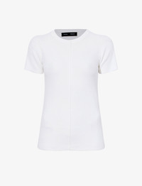 The Sky Top in Matte Viscose Rib is crafted from a rib knit fabrication to a fitted short sleeve silhouette. Detailed with a center seam stitch down the front of the top. Details • White • Rib knit • Crew neck • Short sleeve • Front seam stitch detail • Full length • Slim fit • 81% viscose, 19% polyester • Made in China • SKU: R2427153KY283100 Size & Fit • Model is 5'10'' with 33'' bust / 35'' hips. Wearing size Small Care • 81% viscose, 19% polyester • Dry clean only