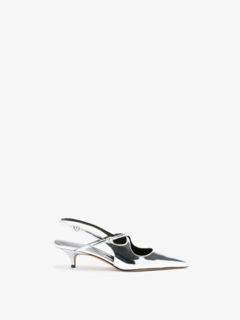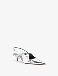 The Slash Crossover Slingback Pumps are crafted with a metallic finish, featuring a pointed toe and a 40mm kitten heel. Accentuated with crossover straps and adjustable silver-tone buckles. Details - Silver - 40mm heel - Pointed toe - Crossover straps - Silver-tone buckles - Upper: 100% polyurethane; Sole: 100% calfskin - SKU: SH252038F001WF041 Size & Fit - True to size Care - Upper: 100% polyurethane; Sole: 100% calfskin - Please refer to care instructions provided with your order.