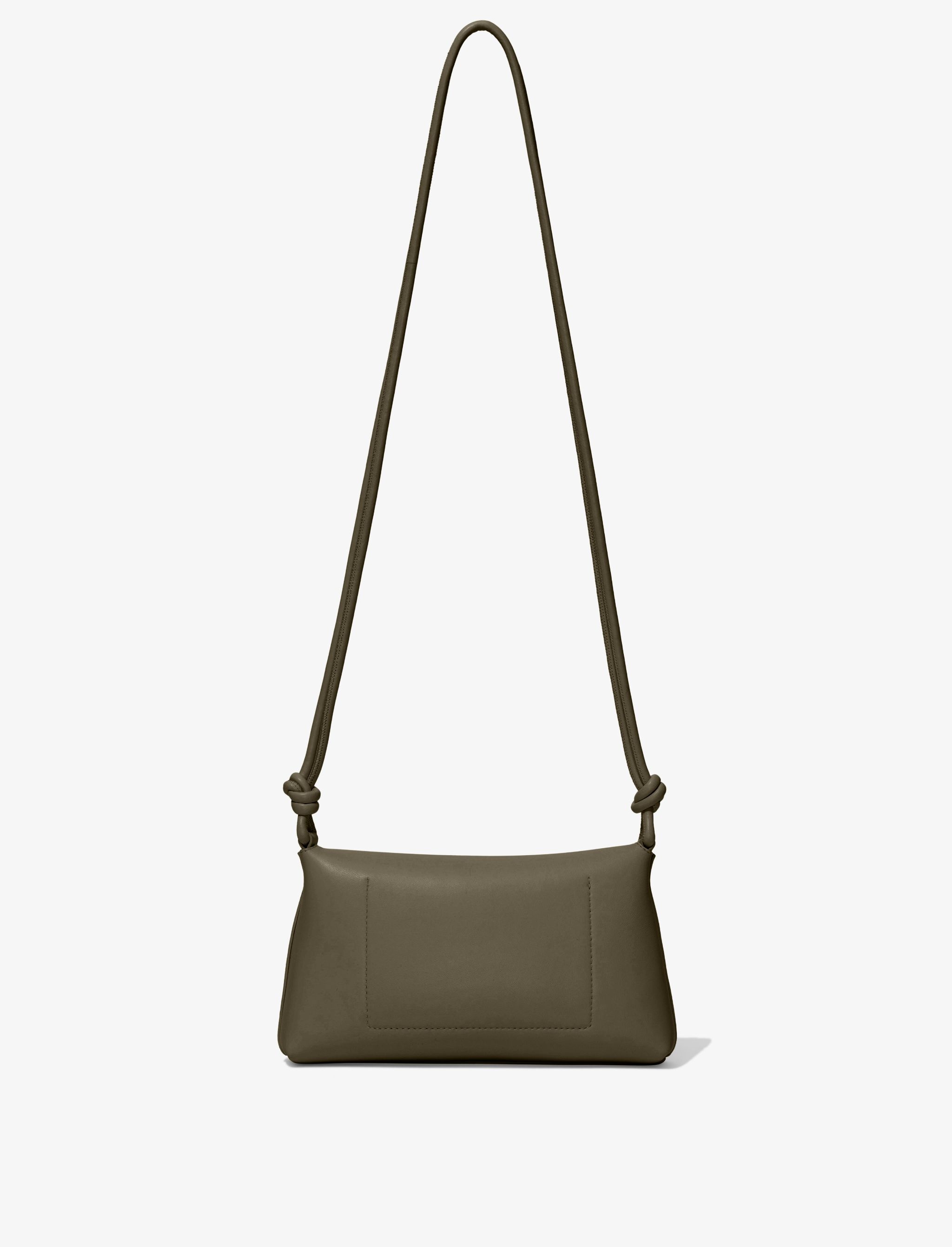The Small Bar Bag is crafted in supple lambskin leather with two curved metal handles. Suspending from a knotted shoulder strap, it can be worn cross-body or as a top-handle bag. Olive green Metal top handles Knotted shoulder strap Open top Gold foil logo at front Gold-tone metal hardware 100% lambskin Made in Italy SKU: HB232018L003G324