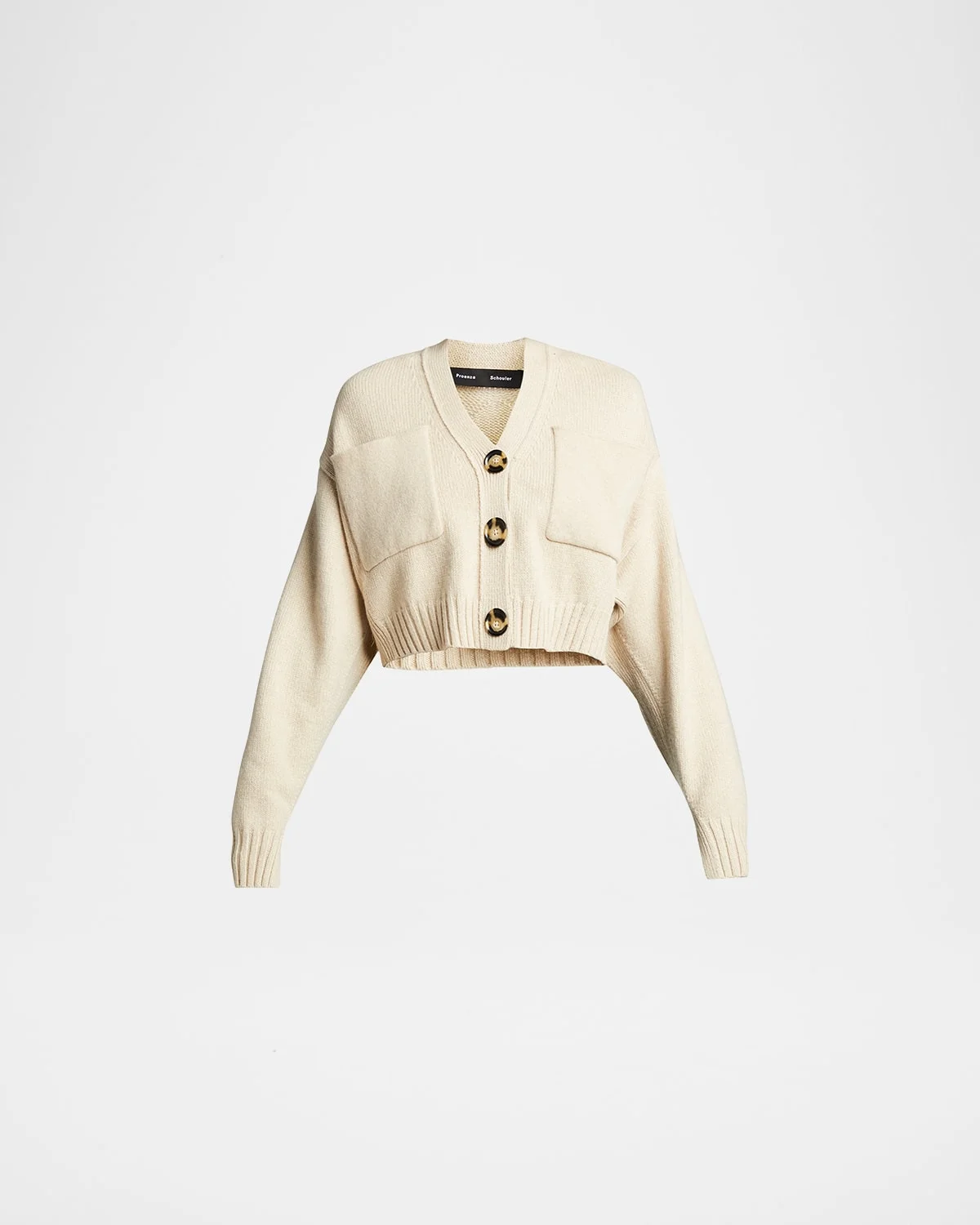 Proenza Schouler cardigan in ribbed knit.V neckline; three-button front.Long sleeves.Chest patch pockets. Ribbed trim.Cropped, boxy fit.Cashmere.Imported.