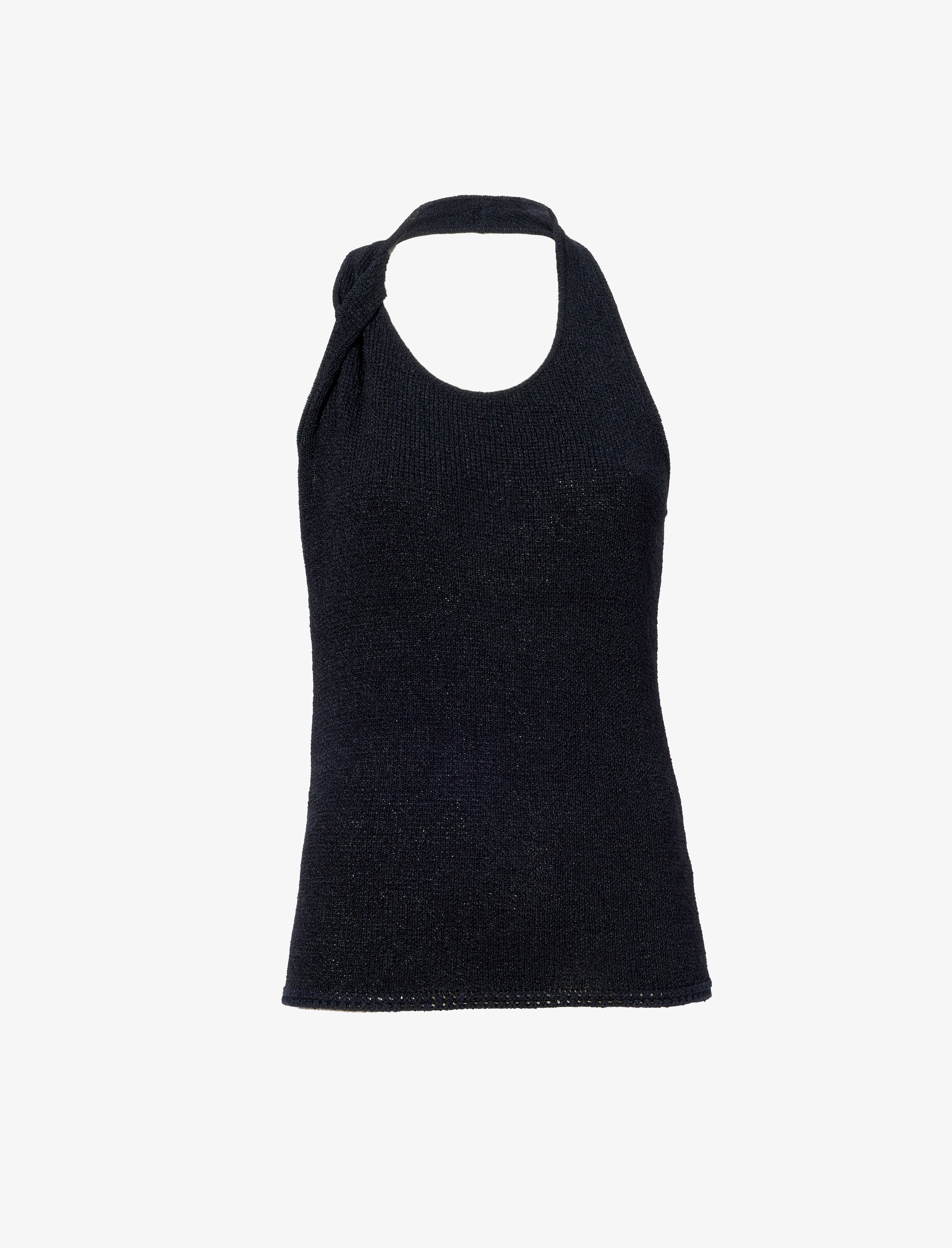 The Stevie Top in Textured Knit features a relaxed silhouette with a halter neck that twists to meet a singular strap before leading to an asymmetrical open back. Details - Black - Crew halter neck - Sleeveless - Twisted strap detail - Asymmetrical open back - Straight hem - Relaxed fit - 88% viscose, 11% nylon, 1% silk - SKU: R2437155KY321001 Size & Fit - Model is 5'10'' with 33'' bust / 35'' hips. Wearing size Small Care - 88% viscose, 11% nylon, 1% silk - Dry clean only