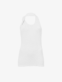 The Stevie Top in Textured Knit features a relaxed silhouette with a halter neck that twists to meet a singular strap before leading to an asymmetrical open back. Details - White - Crew halter neck - Sleeveless - Twisted strap detail - Asymmetrical open back - Straight hem - Relaxed fit - 88% viscose, 11% nylon, 1% silk - SKU: R2437155KY321100 Size & Fit - Model is 5'11'' with 31.5'' bust / 34'' hips. Wearing size Small Care - 88% viscose, 11% nylon, 1% silk - Dry clean only