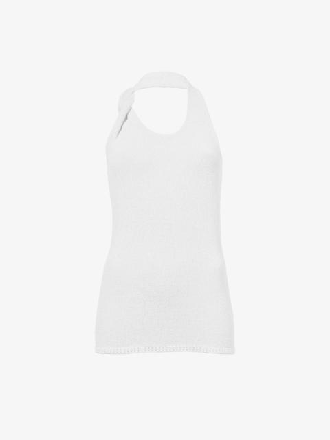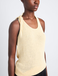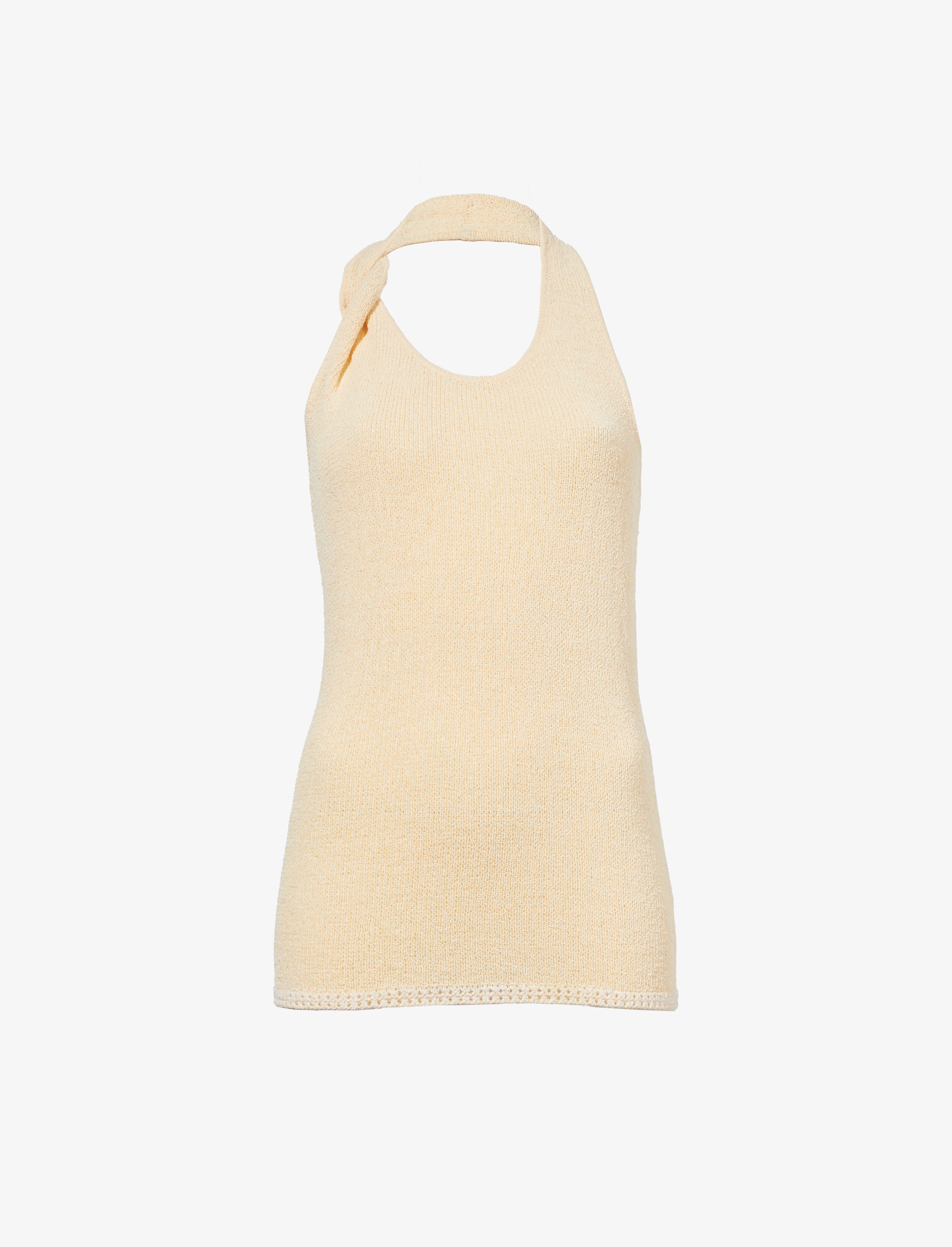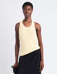 The Stevie Top in Textured Knit features a relaxed silhouette with a halter neck that twists to meet a singular strap before leading to an asymmetrical open back. Details - Yellow - Crew halter neck - Sleeveless - Twisted strap detail - Asymmetrical open back - Straight hem - Relaxed fit - 88% viscose, 11% nylon, 1% silk - SKU: R2437155KY321700 Size & Fit - Model is 5'11'' with 31.5'' bust / 34'' hips. Wearing size Small Care - 88% viscose, 11% nylon, 1% silk - Dry clean only