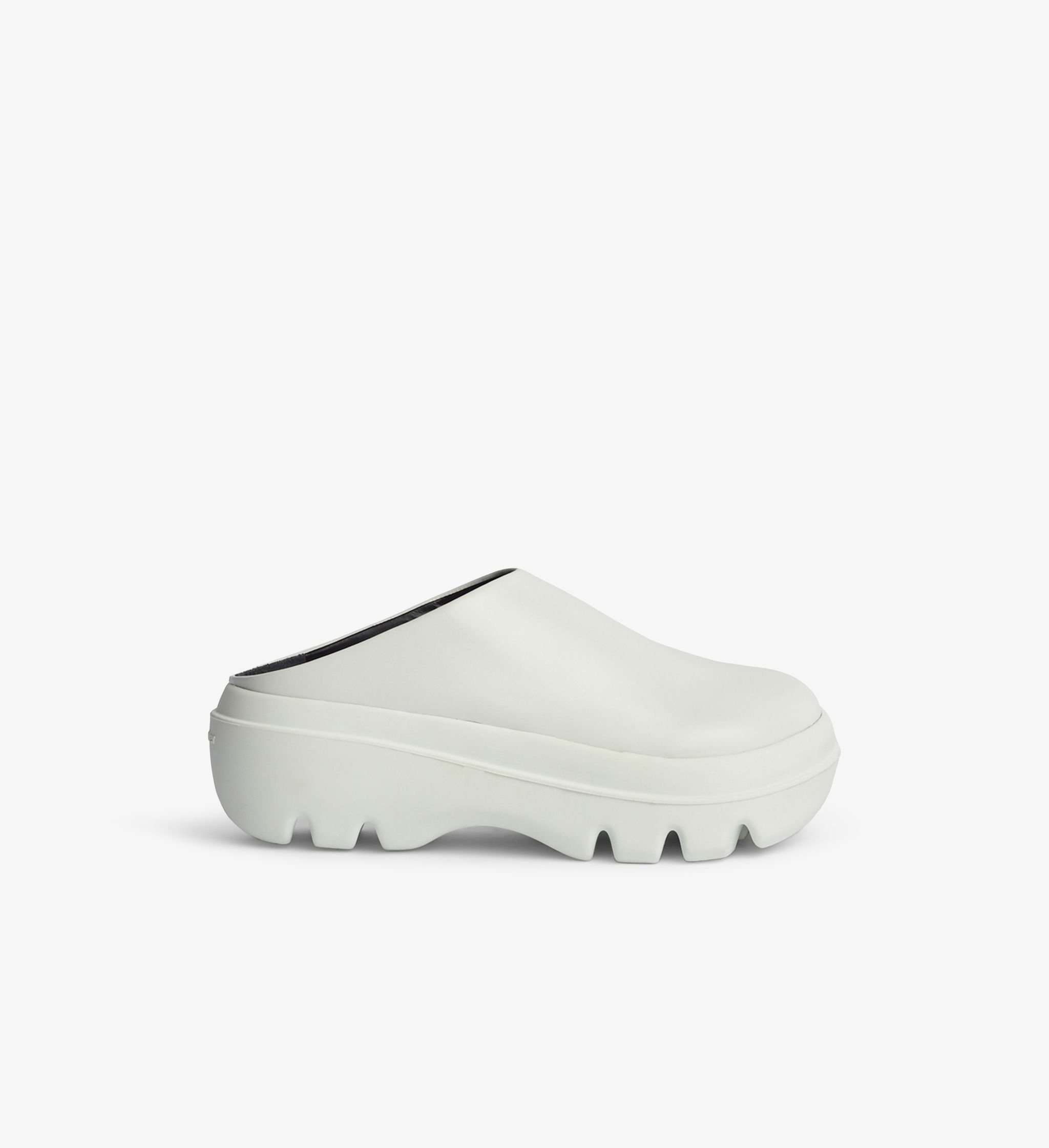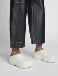 The Storm Slides are crafted in smooth white leather with a chunky rubberized lug sole. Exaggerated round toe. Slip-on mule style. Contrast black interior. Made in Italy. Upper: calf leather Sole: rubber Heel height: 50 mm / 2" SKU: PS38005A15007101