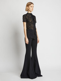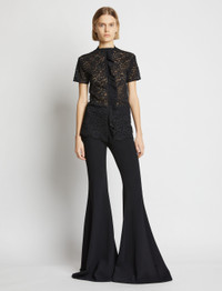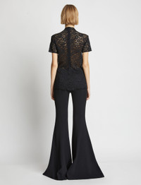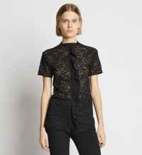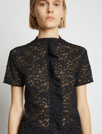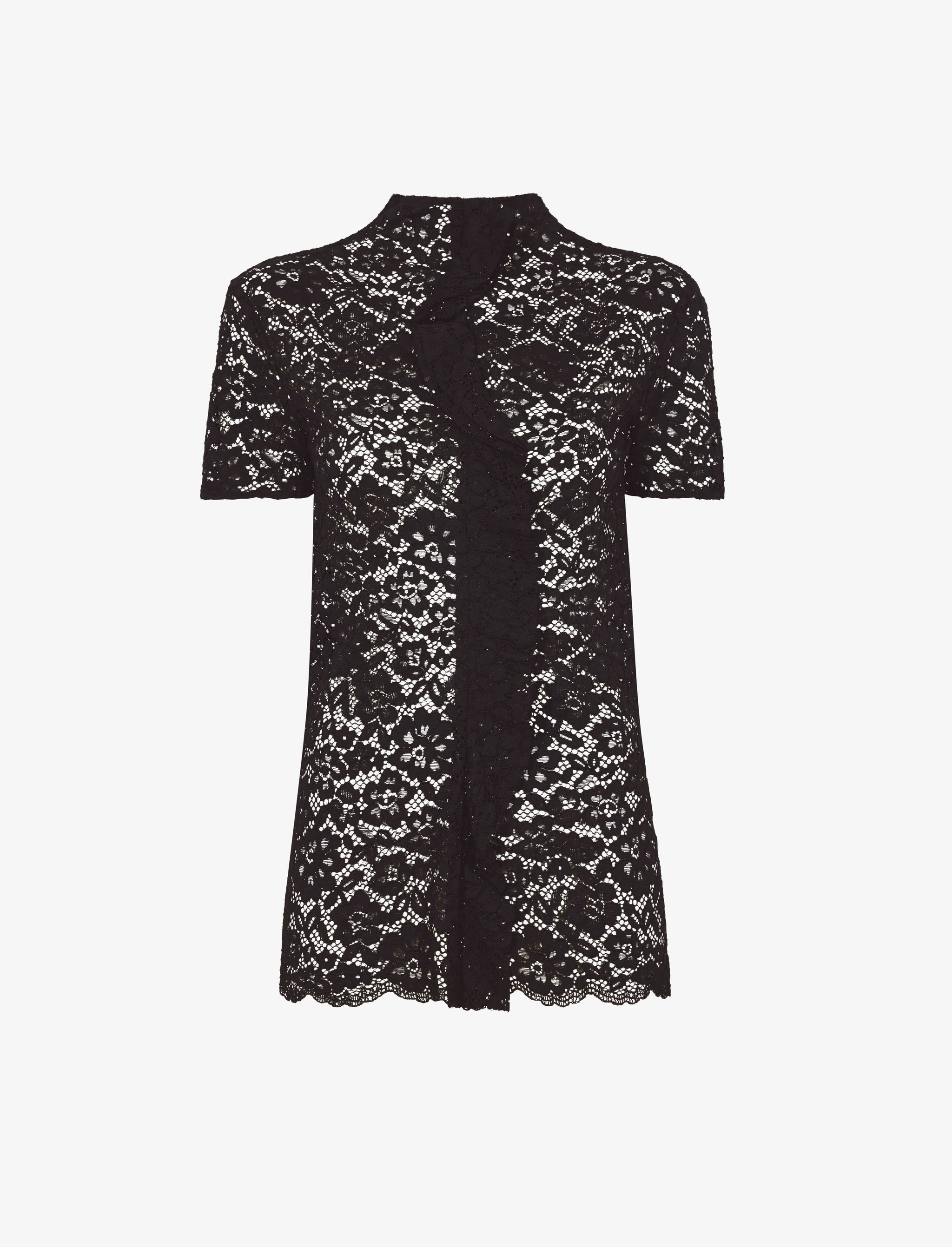 The Stretch Lace Short Sleeve Top is cut in lace with a floral motif to a longline silhouette. Mock neck and short sleeves. Features ruffled trims at the center-front. Visible seams at back. Scalloped hem. Invisible center-back zip closure. Slim fit. 55% nylon, 33.6% viscose, 11.4% elastane. SKU: R2324001FY020S001
