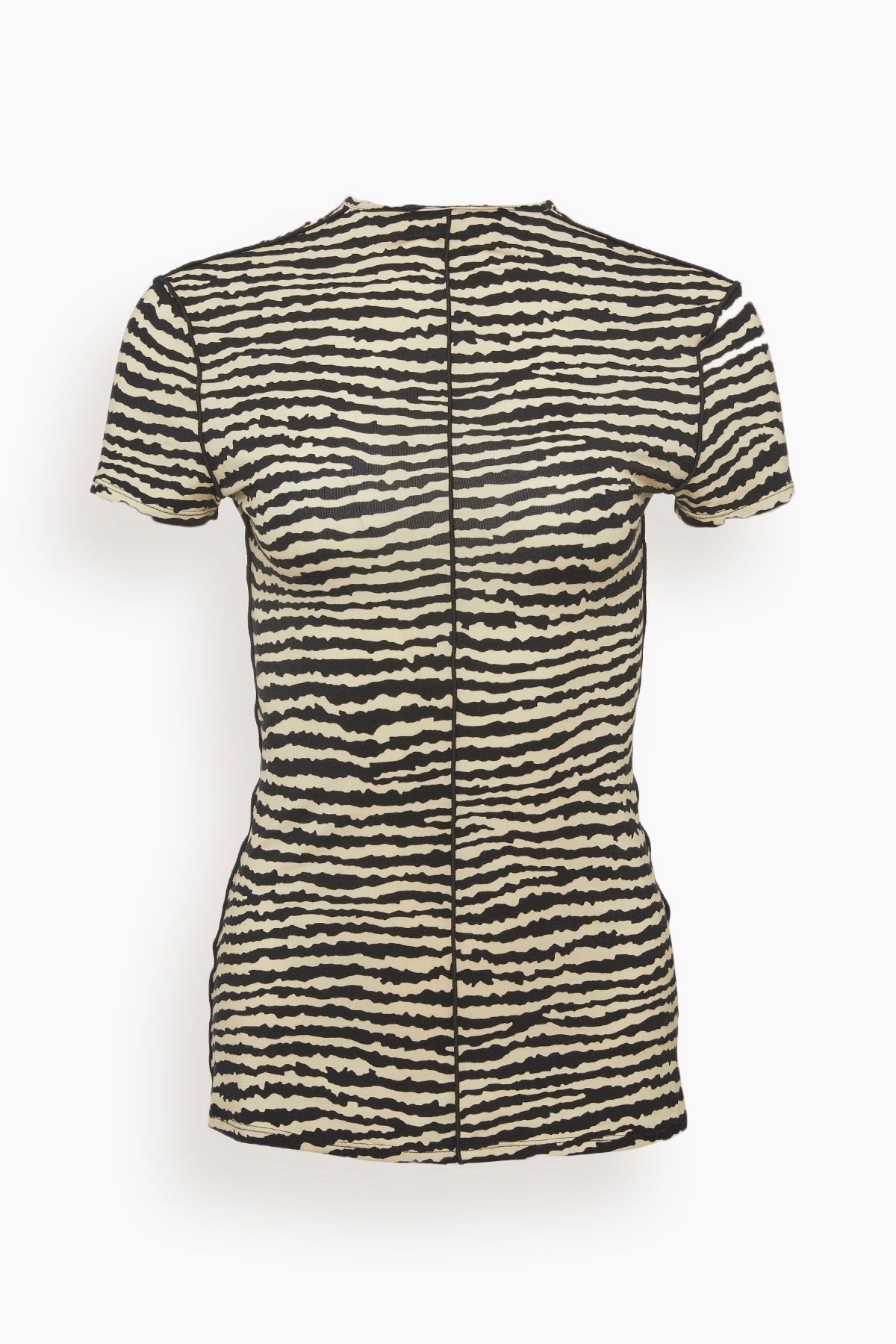 The Proenza Schouler White Label Short Sleeve Jersey Top is a standout piece from their PreFall 22 Collection. This top features a fitted silhouette with a center seam in a bold animal print. Tuck yours in to high rise trousers with lug sole loafers. - Fits true to size, take your normal size - Model is 5'9" and is wearing a size 2 - Fitted silhouette - Mock neckline - Center seam - 97% Rayon, 3% Spandex