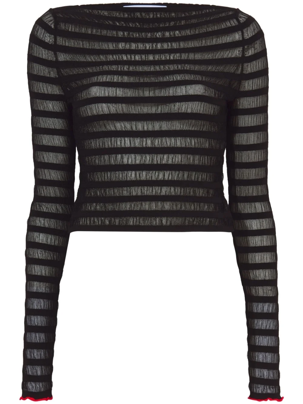striped sheer top Highlights - Black - Sheer - Horizontal stripe pattern - Crew neck - Long sleeves - Straight hem Imported Composition Viscose 71%, Polyamide 21%, Polyester 7%, Elastane 1% Washing instructions Dry Clean Only