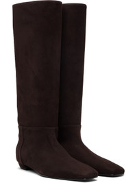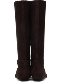 Mid-calf goatskin suede slip-on boots. · Pointed square toe · Buffed leather lining · Block heel with rubber injection · Polished calfskin sole Supplier color: Chocolate Upper: goatskin. Sole: calfskin. Made in Italy 252288F114001