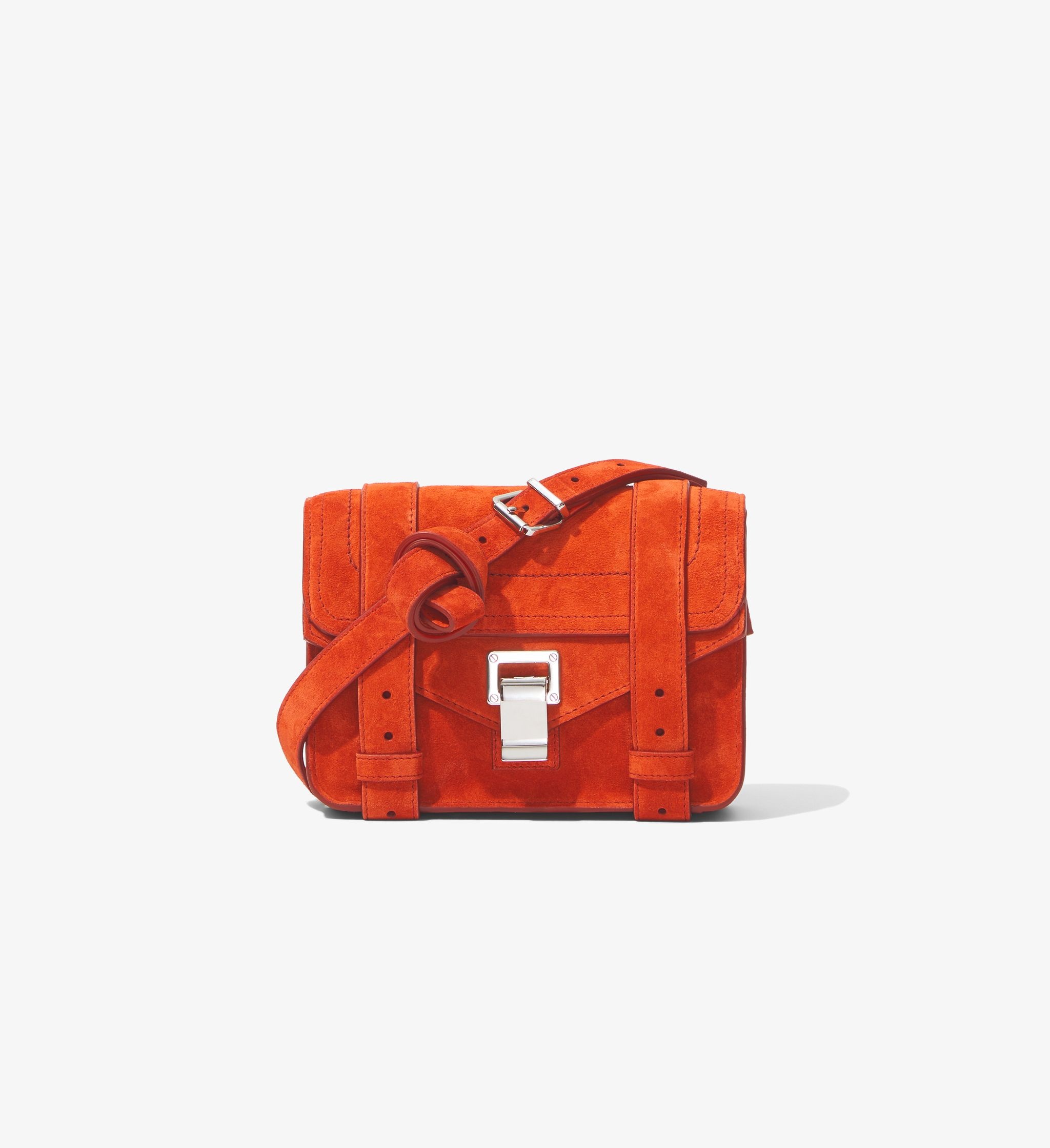 Inspired by traditional workwear satchels, the iconic PS1 family is rooted in function and ease. The Suede PS1 Mini Crossbody Bag is crafted in red suede and secured by a signature silver-tone metal tab closure and belted straps. Features an interior compartment with a durable canvas lining and logo-embossed patch pocket. Includes a removable, adjustable shoulder strap with a silver-tone metal buckle. Tonal hand-painted edges. Enameled logo tag. Leather. Made in Italy. The PS1 family consists of a Micro, Mini Crossbody, Tiny, Medium, and Large. The PS1 Mini Crossbody is the second smallest of the family. W: 20cm x H: 15cm x D: 7.5cm Shoulder Strap: 57cm SKU: H00338C005P614