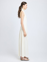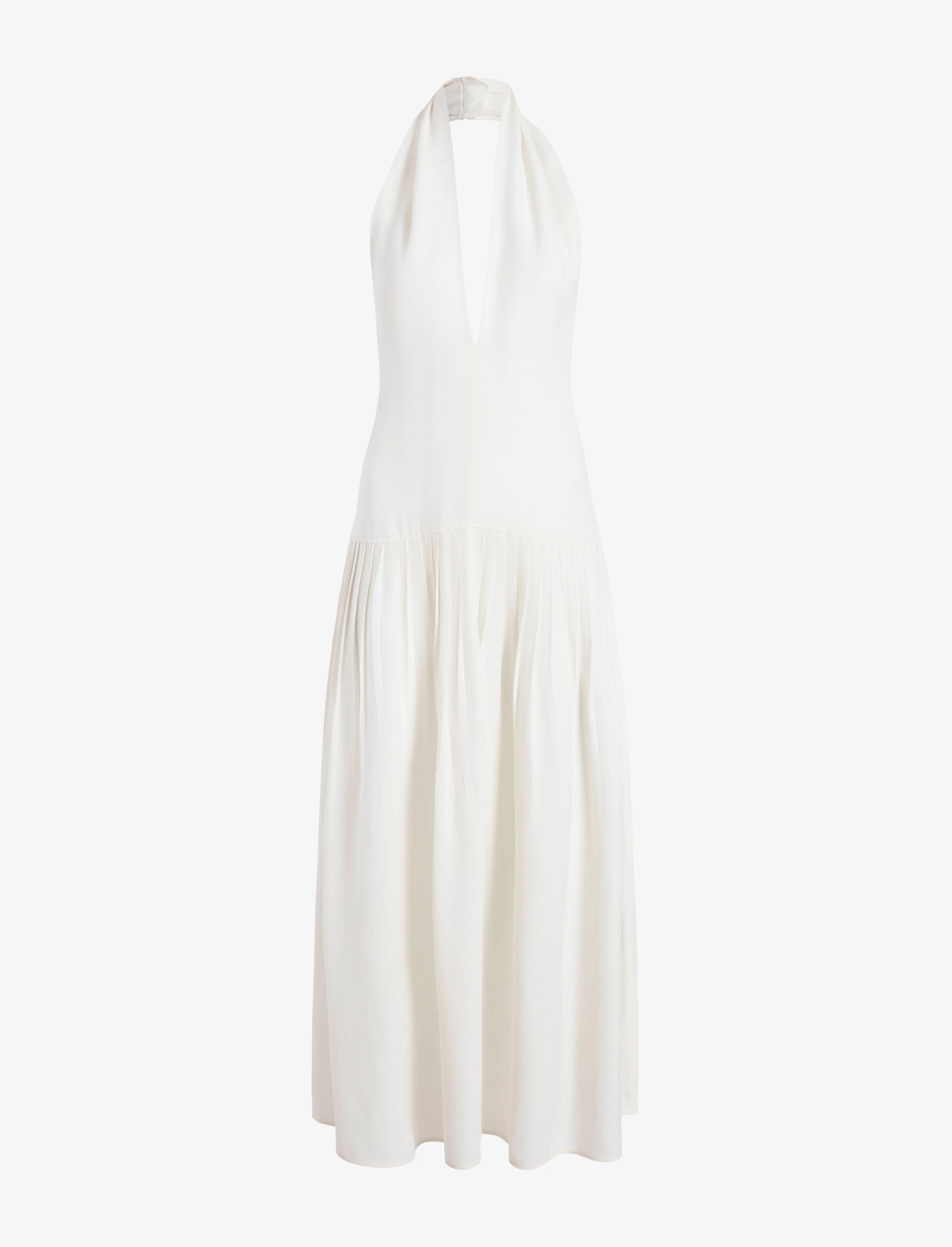 The Tala Dress in Viscose Georgette is cut to a halter neck drop-waist silhouette with a deep V-cut, accentuated by light pleating throughout the skirt. Details - Cream - Plunging V-neck - Halter top - Sleeveless - Scoop back - Concealed back zipper closure - Pleated skirt - Maxi-length hem - Slim fit - 100% viscose - SKU: R2533005BY043105 Size & Fit - Model is 5'11'' with 30'' bust / 35.5'' hips. Wearing size 4 Care - 100% viscose - Dry clean only