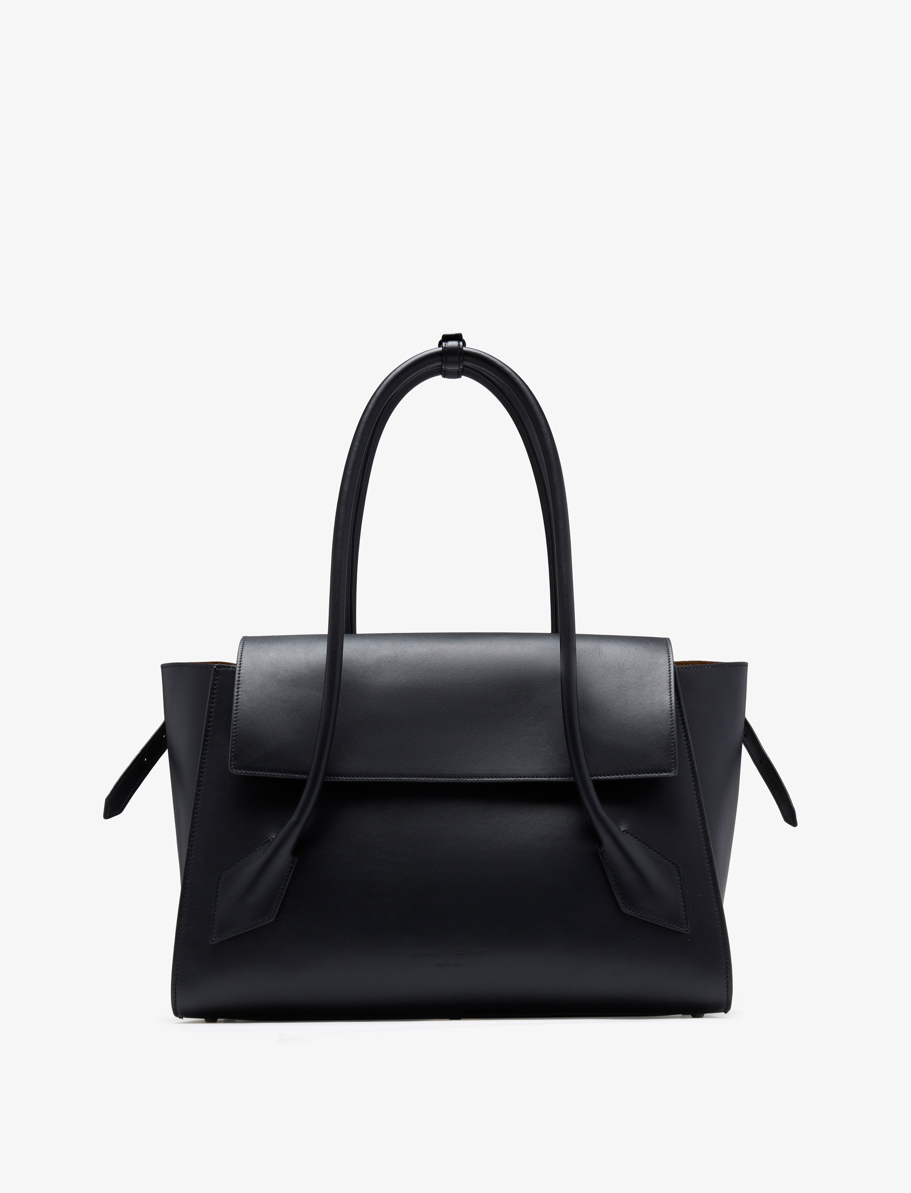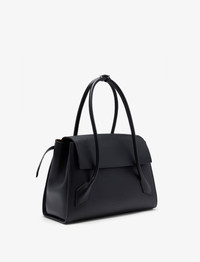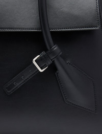 The Tate Bag is crafted in smooth leather to a large satchel, featuring two handles that extend from the lowest point of the bag, complemented by a keeper strap to hold the handles together. Refined with a front flap closure that can either be tucked into the bag opening or worn outside. The design is accentuated by buckles on both sides, a back slip compartment, and metal feet along the bottom for added protection. Details • Black • Large satchel • Two handles • Keeper strap • Front flap closure • Side buckle details • Back slip compartment • Protective metal feet • Silver-tone hardware • Suede lined • Embossed logo at center bottom • 100% calfskin • SKU: HB251081C327S001 Size & Fit • W: 38cm x H: 26.5cm x D: 15cm • Shoulder Drop Length: 21cm Care • 100% calfskin • Our bags are hand crafted using genuine leather. Variations in tone, marks or grain are common and should not be considered imperfections. Like all natural materials, leather reacts to the atmosphere. Humidity, rain, and sunlight can damage leather. Should a slight white coating appear on the surface of the leather, it can easily be removed using a dry cloth. Should the leather get wet, please absorb the water immediately with a dry cloth. Overexposure to sunlight can stain or alter the color of the leather.