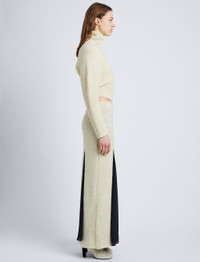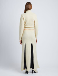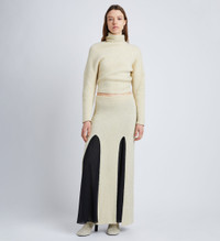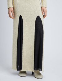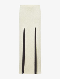 Fall 23 Runway Collection | Look 35 The Technical Sequin Knit Skirt is cut for a slim silhouette and saturated with sequins. Detailed with a maxi-length hem that's sliced at the front and back, revealing contrasting chiffon beneath. Ecru Sequin embellishment Mid-rise elasticated waist Front and back splits Chiffon lining Straight maxi-length hem Slim fit 55% polyamide fibre, 45% polyester fibre Made in Italy SKU: R2347104BKY302103