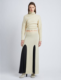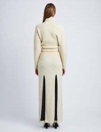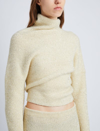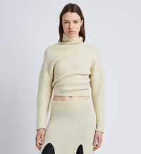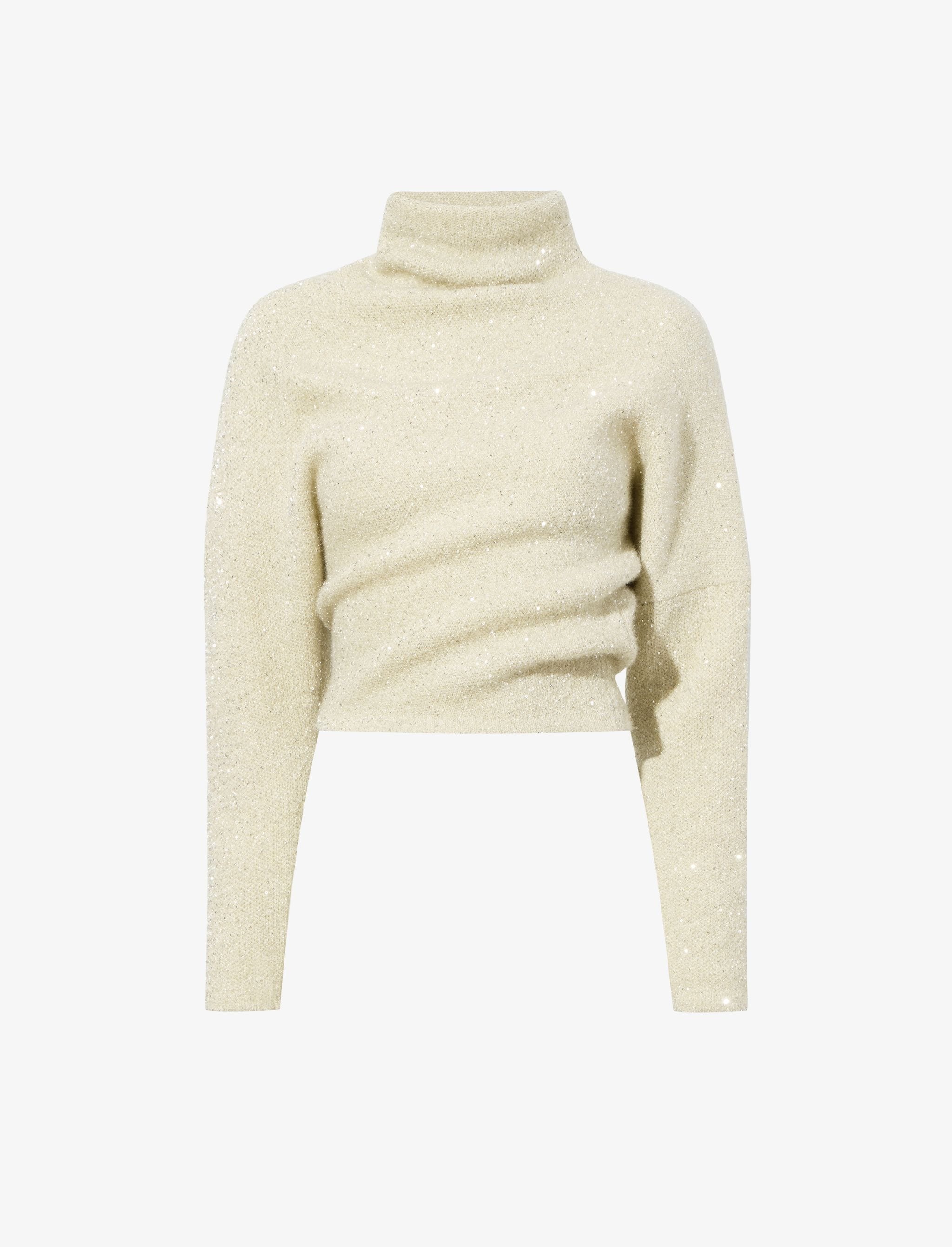 Fall 2023 Runway Collection | Look 35 The Technical Sequin Sweater is characterized by its gently twisted silhouette and sequin-saturated finish. Framed by a high neck, long sleeves and a cropped hem. Ecru Sequin embellishment Funnel neck Long sleeves Twisted silhouette Ribbed-knit trim Straight cropped hem 55% polyamide fibre, 45% polyester fibre Made in Italy SKU: R2347103KY302103