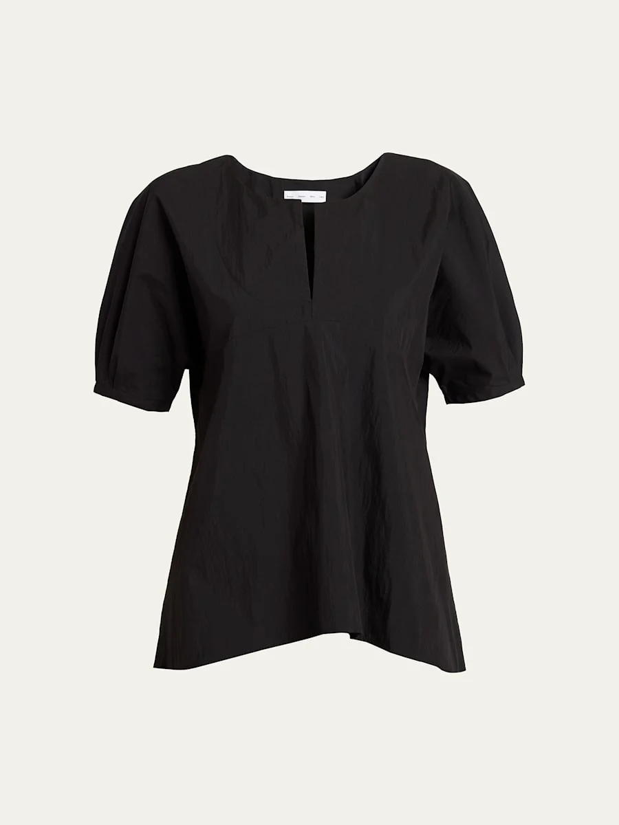 Proenza Schouler "Tia" blouse crafted from parachute cotton with a sleek finish Split Vneckline Short puff sleeves Loose fit Highlow hem Pullover style Cotton/nylon/polyamide Dry clean Imported SIZE amp; FITModel measurements: 5'10" tall Model is wearing a US size 4/Small