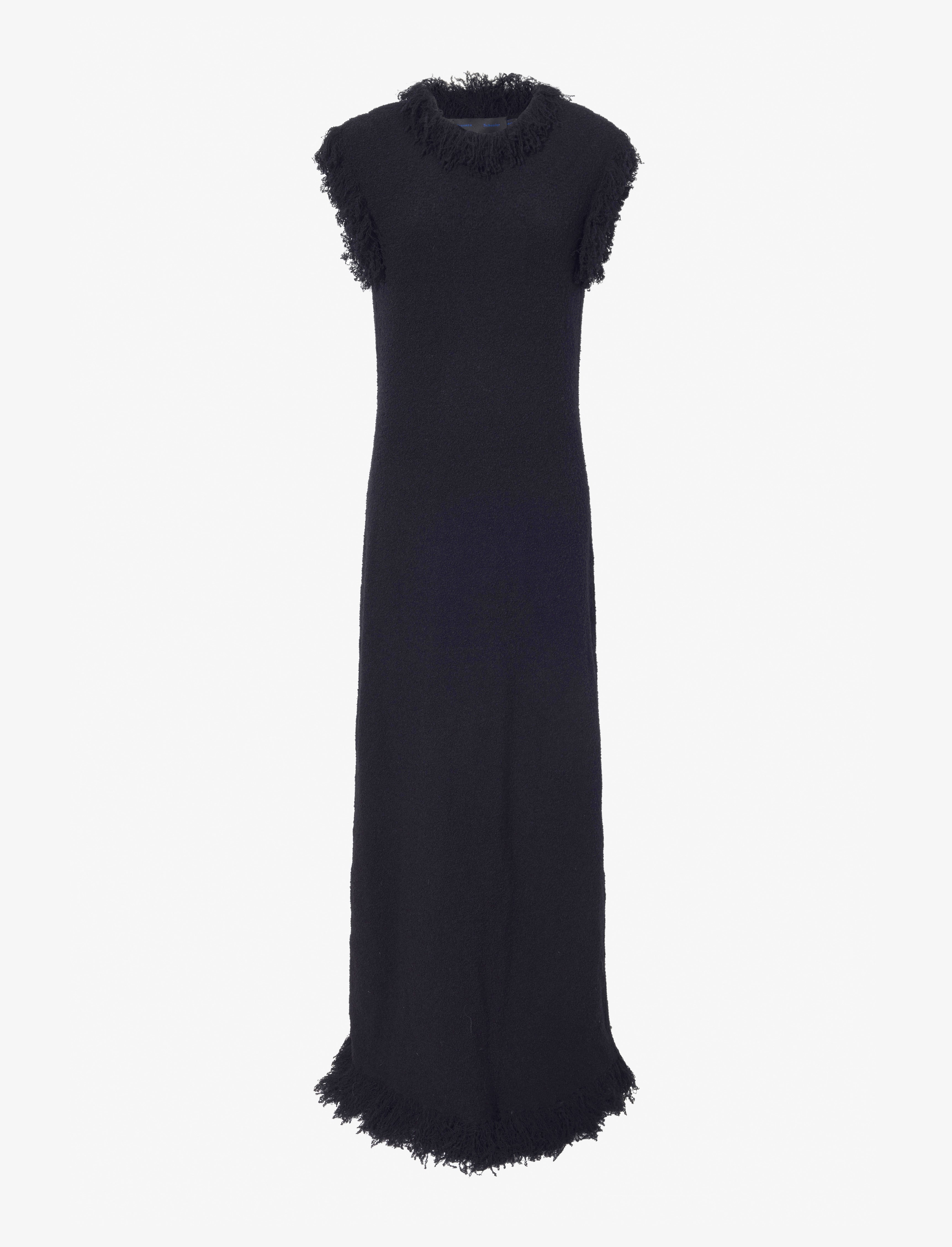 Fall 2024 Runway Collection | Look 38 The Toni Dress in Textured Knits is crafted to a straight-line silhouette with frayed edges. Detailed in the back with a deep keyhole cut-out and high slit. Details - Black - Textured knit - Crew neck - Keyhole cut-out - Back slit - Frayed hems - Straight silhouette - Ankle length - 49% wool, 28% polyamide, 19% viscose, 4% polyester - SKU: R2447229KY336001 Size & Fit - Model is 5'9'' with 30'' bust / 34.5'' hips. Wearing size Small Care - 49% wool, 28% polyamide, 19% viscose, 4% polyester - Dry clean only