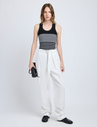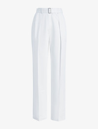 The Vera Pant in Cotton Linen Suiting is tailored to a high-waisted silhouette with a concealed fastening and tonal slider belt. Falling tapered through the leg, they are accentuated with center pleats and side slip pockets. Details - White - High-waisted - Belt loops - Slider belt - Silver-tone hardware - Concealed front closure - Side slip pockets - Center pleats - Tapered leg - Full-length hem - 77% cotton, 23% linen - SKU: R2536000AC156100 Size & Fit - Model is 5'9.5'' with 32'' bust / 34'' hips. Wearing size 4 Care - 77% cotton, 23% linen - Dry clean only