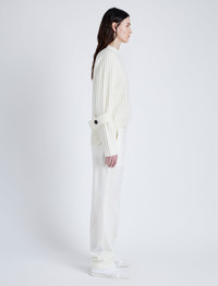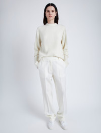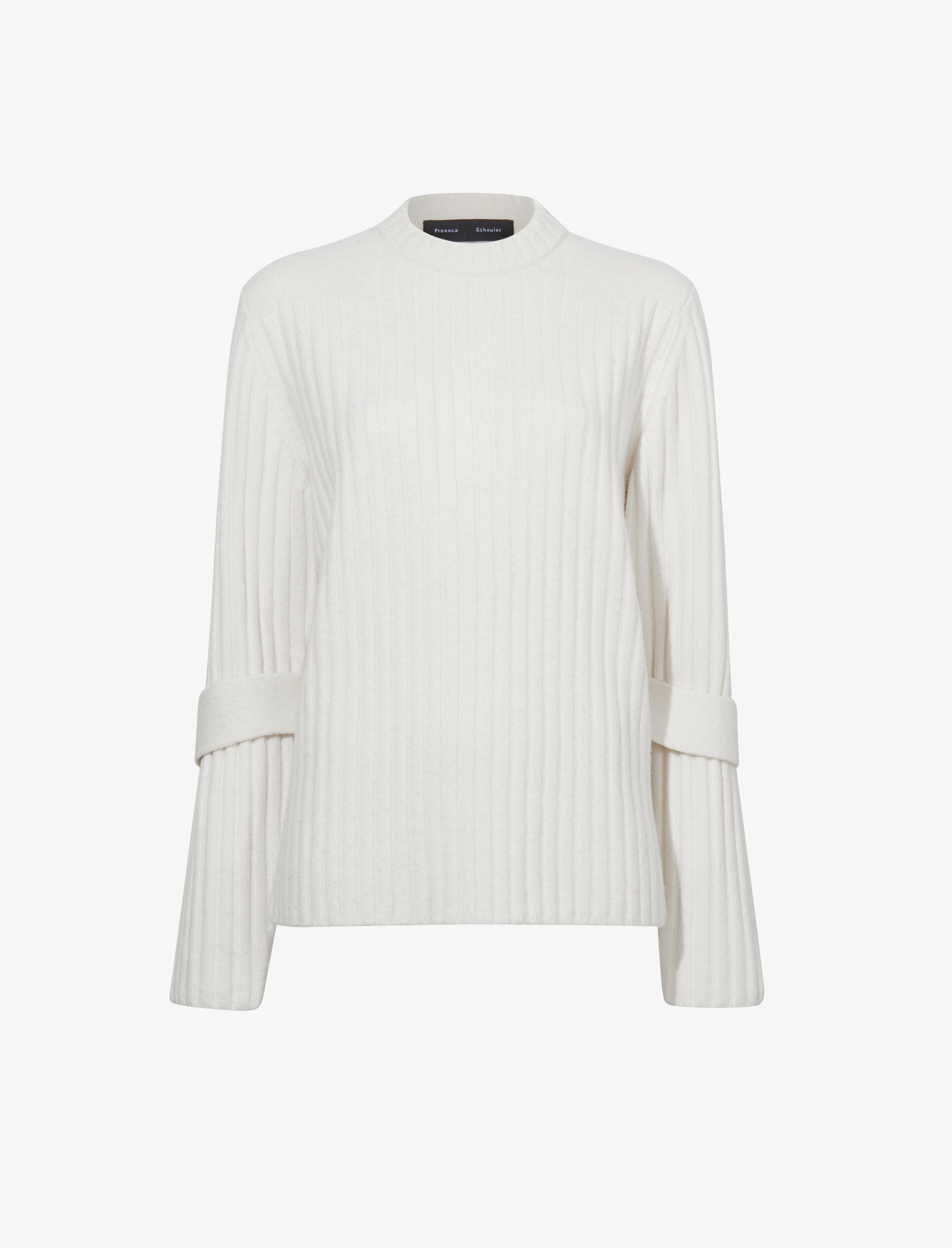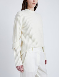 The Verona Sweater in Midweight Cashmere Rib is knit to a relaxed silhouette with a crew neckline. Detailed with buttoned sleeve belts. Details - Bone - Crew neck - Long sleeve - Buttoned sleeve belts - Straight hem - Relaxed fit - 53% merino wool, 31% nylon, 10% cashmere, 6% spandex - SKU: R2447192KW163123 Size & Fit - Model is 5'10'' with 31.5'' bust / 34'' hips. Wearing size Small Care - 53% merino wool, 31% nylon, 10% cashmere, 6% spandex - Dry clean only