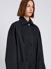 The Verretta Coat in Coated Cotton is crafted to a voluminous trench silhouette, complete with exaggerated patch pockets and a flounced bubble hem. Details - Black - Point collar - Wide long sleeves - Button fastenings - Patch pockets - Bubble hem - Exaggerated silhouette - Fully lined - 70% polyester, 30% cotton - SKU: R2541003AY210W001 Size & Fit - Model is 5'10'' with 31'' bust / 34'' hips. Wearing size 4 Care - 70% polyester, 30% cotton - Dry clean only