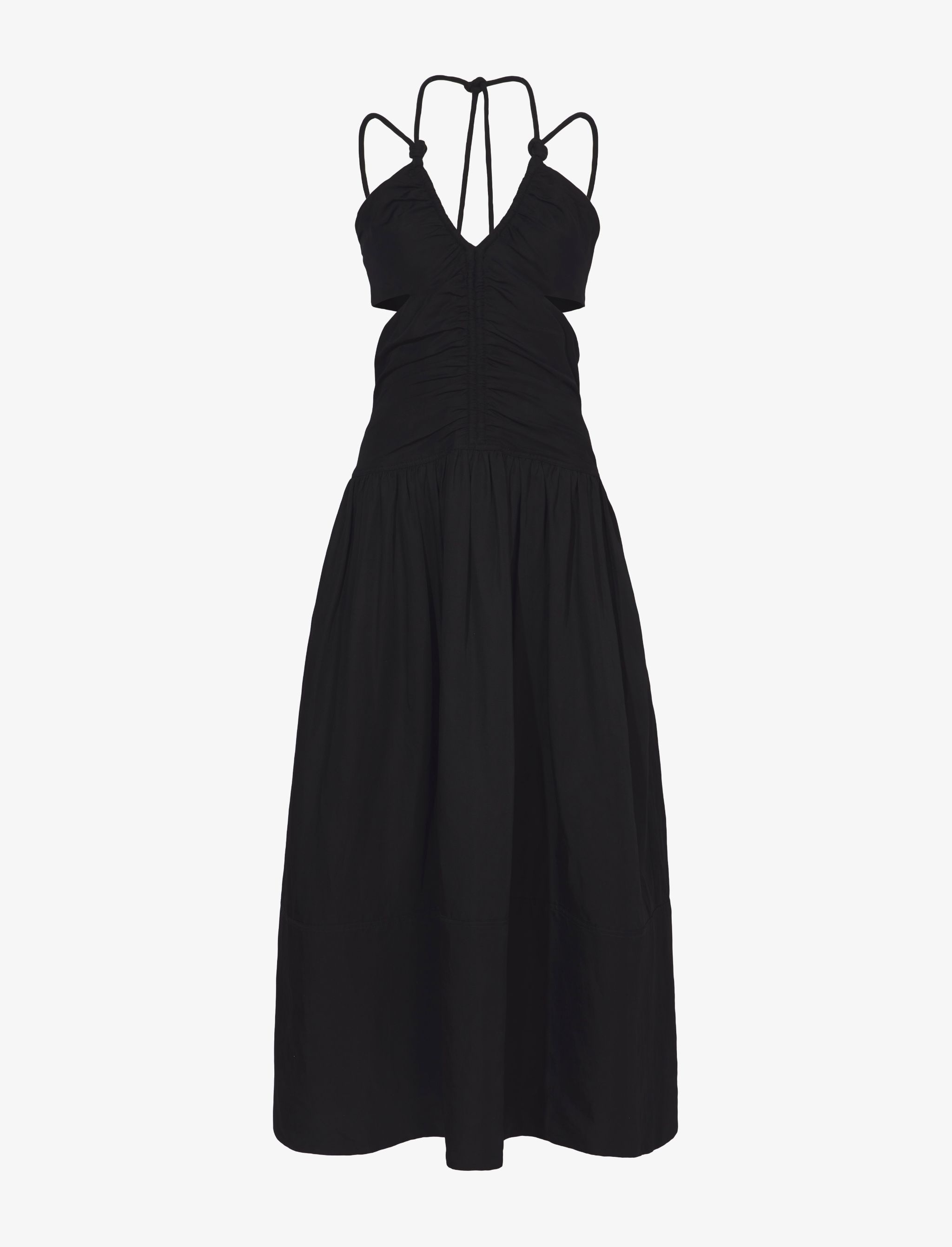 The Viscose Linen Dress is cut to an A-line silhouette with a drop waist. Featuring knotted straps and ruching at the neck and center front. Black V-neck Self-tie halterneck strap Knotted shoulder straps Side cut-outs Ruching at center front Slip side pockets Straight mid-length hem Concealed hook and zip back fastening Slim fit 72% viscose, 28% linen SKU: R2333012BY271S001