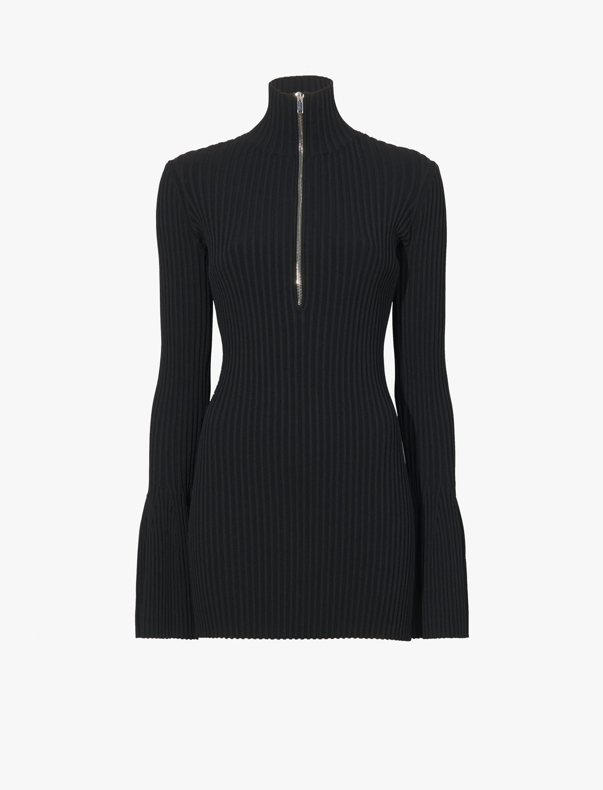 The Viscose Rib Zip Sweater features a ribbed-knit construction. Funnel neck with front quarter-zip closure. Long sleeves with extended, flared cuffs. Slim fit. 83% viscose, 17% polyester. SKU: R2247012KY224S001