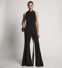Spring 2023 Runway Collection | Look 6 The Viscose Tuxedo Stripe Jumpsuit is tailored to a fitted silhouette and features a wrap front secured with a hammered gold-tone metal button. High V-neck. Sleeveless. Side welt pockets. Visible seams at front and back. Exaggerated flared legs with contrast stripe at inseam. Invisible center-back zip closure. 97% viscose, 3% elastane. Made in Italy. SKU: R2328001AY162002
