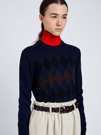 The Vivian Top in Argyle Knit is knitted in a tri-color argyle print, featuring a crew-neck silhouette complete with small ribbed trims. Details - Navy multi - Lightweight - Argyle print - Crew neckline - Long sleeves - Ribbed-knit trims - Slim fit - 75% extrafine merino, 25% silk - SKU: R2547279KW190466 Size & Fit - Model is 5'11'' with 30'' bust / 35.5'' hips. Wearing size Small Care - 75% extrafine merino, 25% silk - Dry clean only